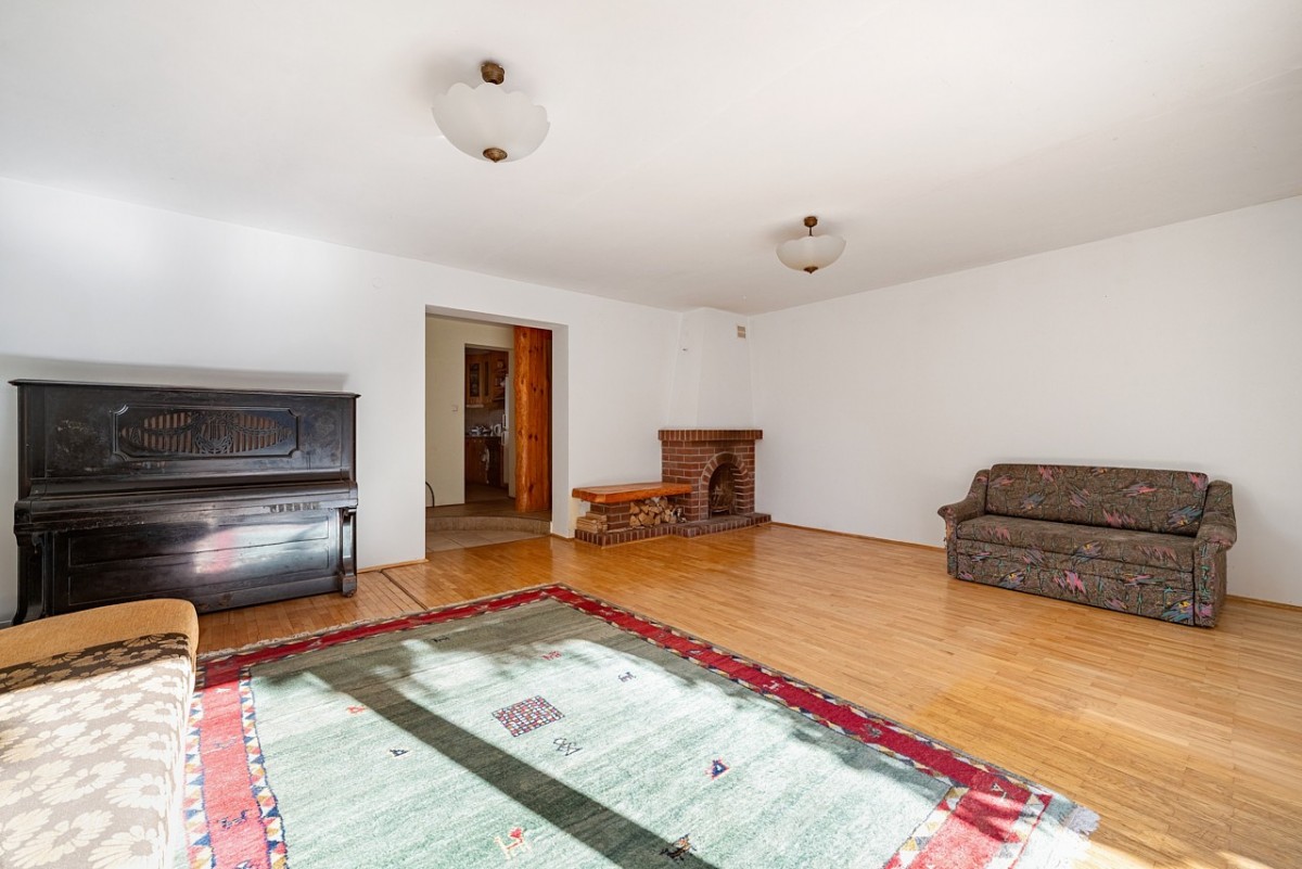 Salon z kominkiem o powierzchni 32 mkw. z wyjściem na duży taras.