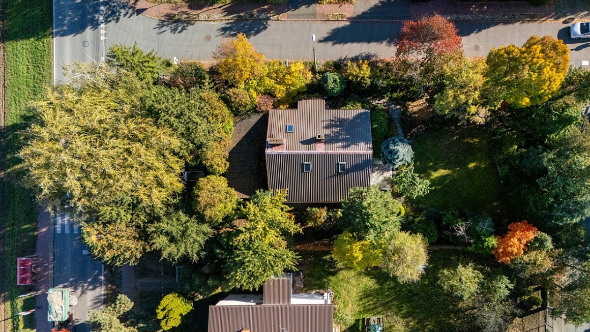 Dom posadowiony na narożnej działce o powierzchni o 893 o wymiarach 19,86 x 45,14 metra.
