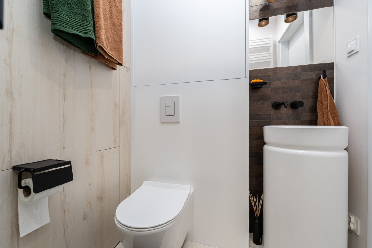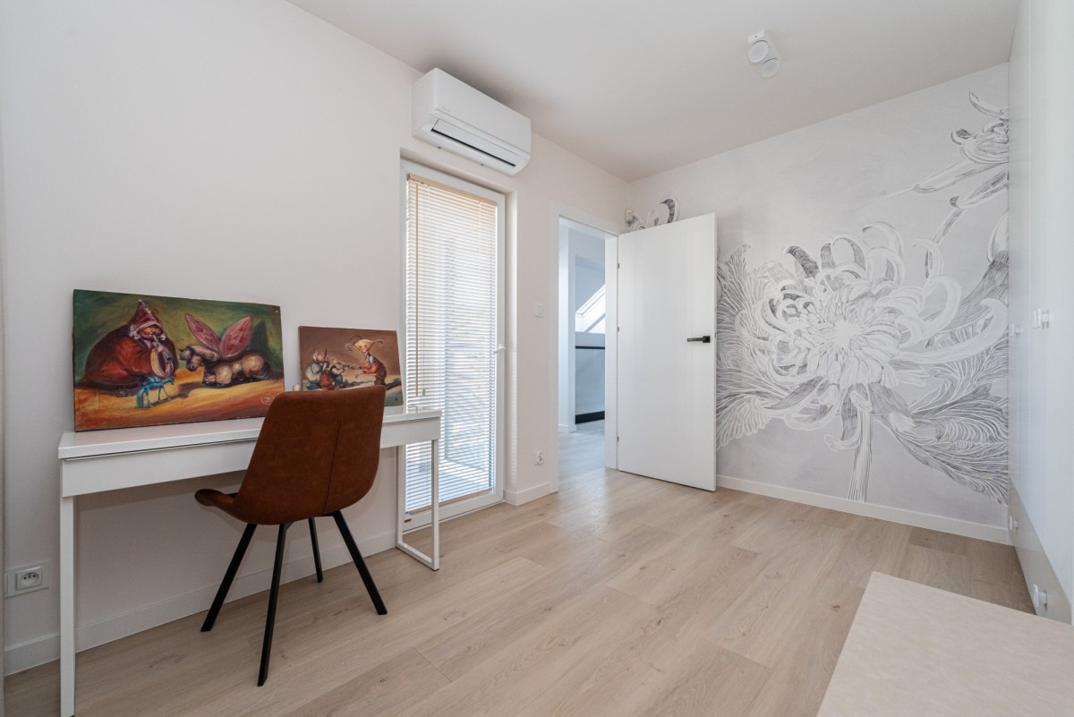 Salon i hol tworzą łącznie niemal 20-metrową przestrzeń. Jadalnia (ok. 8,5m2) jest połączona z kuchnią (ok. 8,7m2) z funkcjonalną wyspą. W kuchni znajduje się też ukryta spiżarnia (ok. 2,5m2) z mnóstwem miejsca do przechowywania. Na parterze znajduje się również gabinet, czy też pokój gościnny (ok. 12m2) z rozkładaną kanapą, biurkiem oraz prywatną łazienką z prysznicem, WC i umywalką.