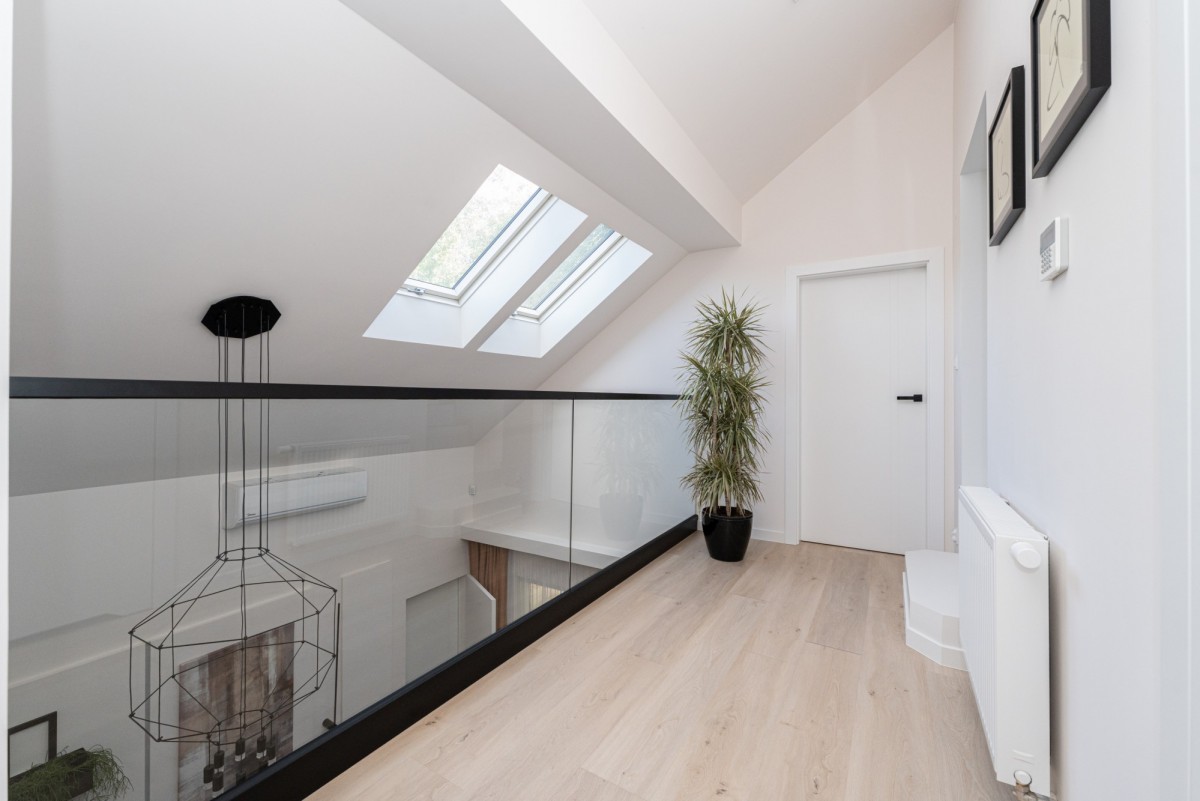 Do nieruchomości wchodzi się przez ponad 3 metrowym przedpokój z ukrytą za lustrzaną ścianą przestrzenią do przechowywania i połączony z resztą domu eleganckim przeszkleniem. Sufit w salonie ma w najwyższym punkcie ponad 5 metrów wysokości dzięki antresoli ze szklaną balustradą, a okno połaciowe zapewnia optymalne doświetlenie.