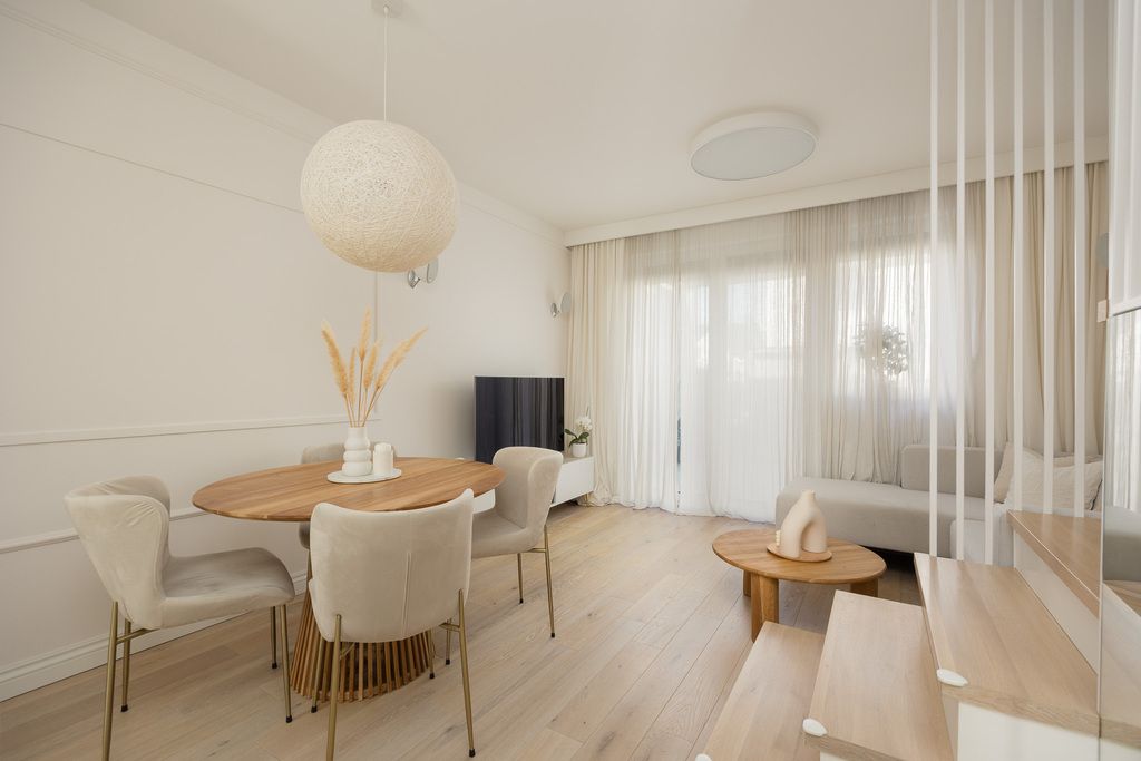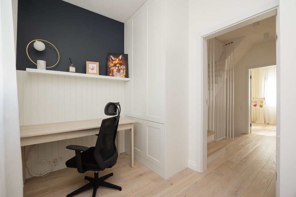 Dom został zaprojektowany przez architekta wnętrz i urządzony w spójnym, eleganckim stylu, z dbałością o każdy detal. Drewniane podłogi, meble wykonane na wymiar i przemyślana kolorystyka tworzą harmonijną całość. Komfort codziennego użytkowania podnosi ogrzewanie podłogowe, które zostało zainstalowane w wiatrołapie, kuchni, salonie oraz łazience na piętrze. Dla zwiększenia bezpieczeństwa, na parterze zamontowano rolety antywłamaniowe, a przy wejściu i w ogrodzie zainstalowany został monitoring z kamerami, który daje domownikom poczucie spokoju i kontroli.