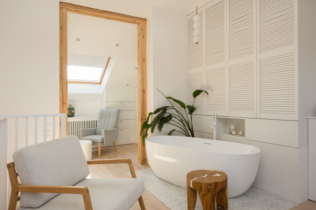 • Strefa prywatnego relaksu: przestronny salon kąpielowy z wanną, połączony z garderobą i sypialnią, tworząc wyjątkowe, intymne wnętrze – 17,18 m².