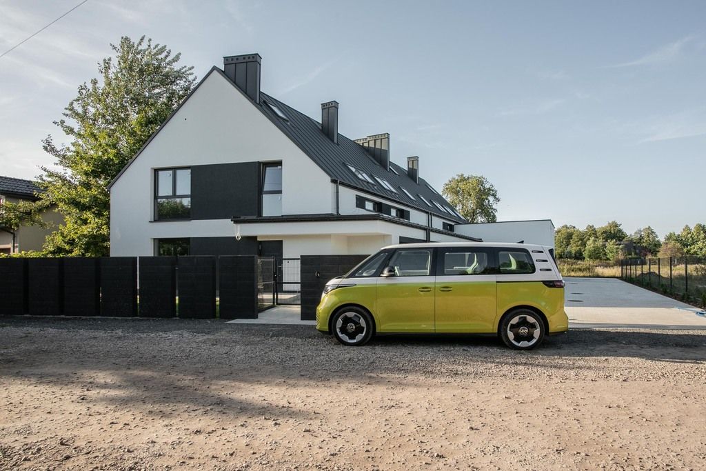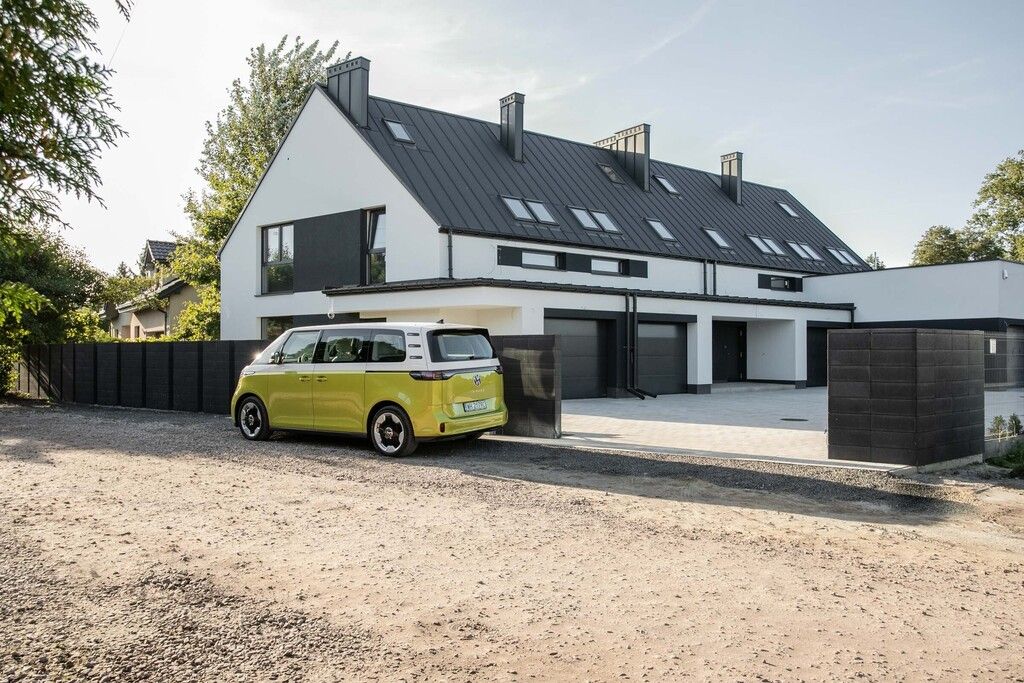 Budynek zachwyca formą nowoczesnej stodoły, a wyjątkowego charakteru nadają mu stylowe wykusze garaży oraz wnęki wejściowe, ukryte pod efektownym frontowym podcieniem.
