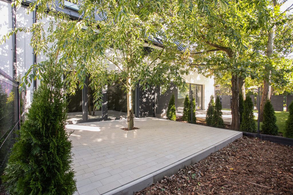 - duży, utwardzony taras z wkomponowanym drzewem,