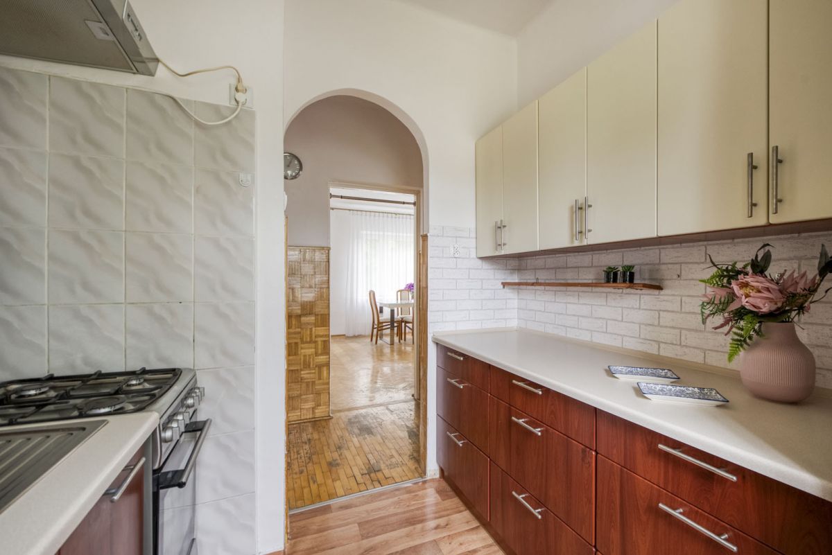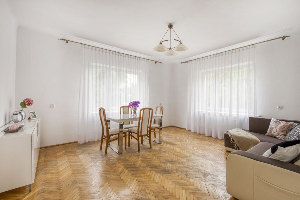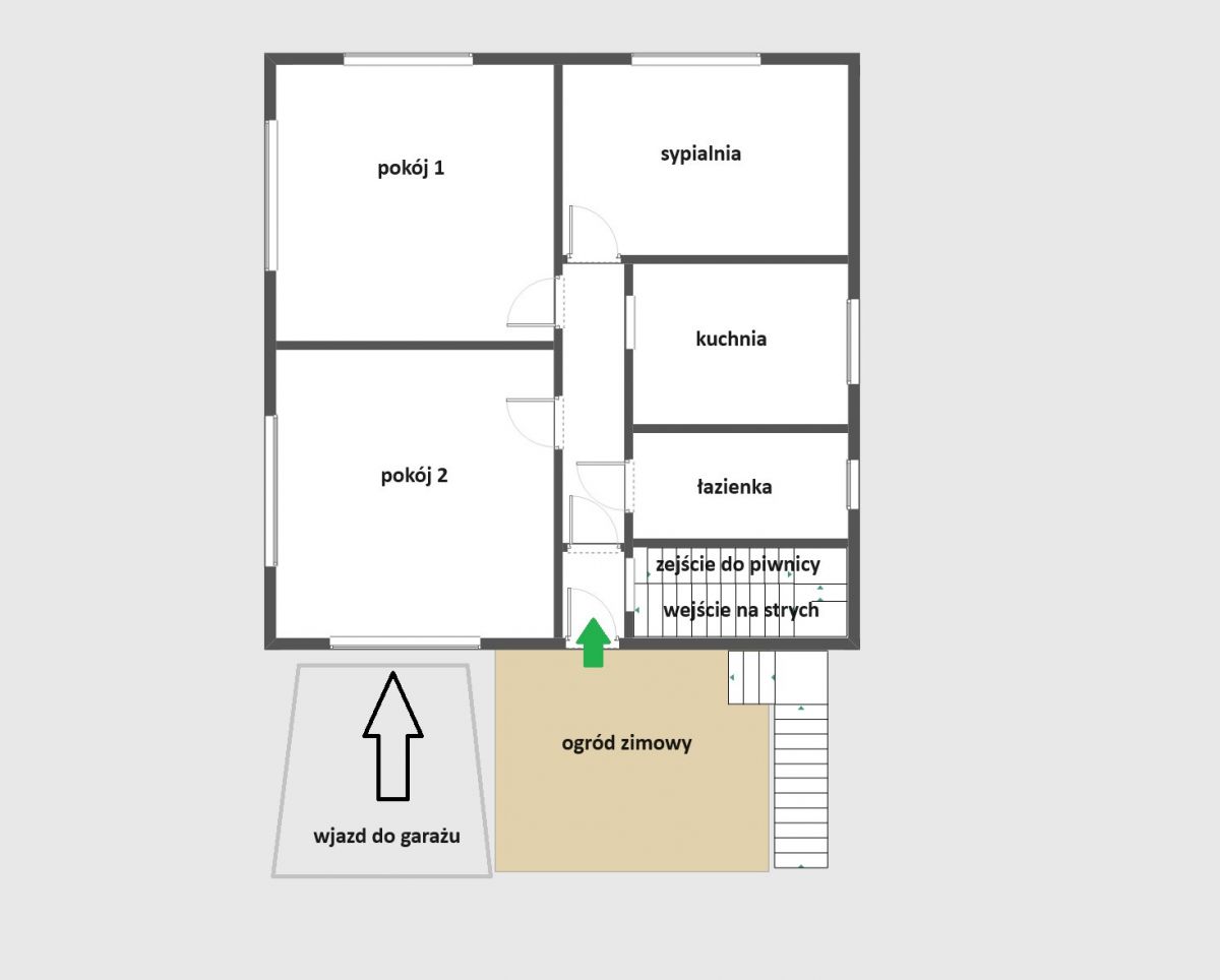 Powierzchnia całkowita to 150 m2. Część użytkowa na wysokim parterze to około 80 m2, resztę stanowi piwnica z garażem.