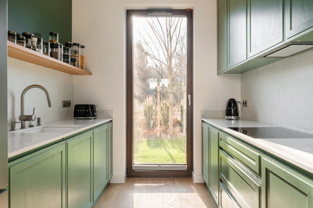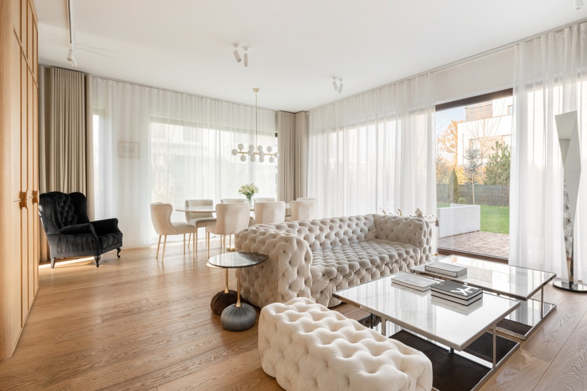 • wysoki standard wykończenia: dębowa deska na podłodze w części dziennej i sypialniach, drewniane drzwi na pełną wysokość kondygnacji, zabudowa stolarska wykonana wg indywidualnego projektu, naturalny kamień w łazienkach