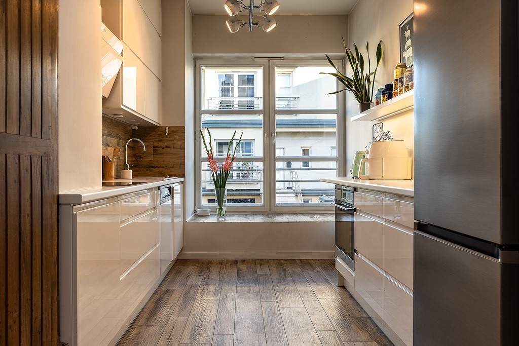 - otwarta kuchnia 10,84 m² z dużym dwuskrzydłowym oknem