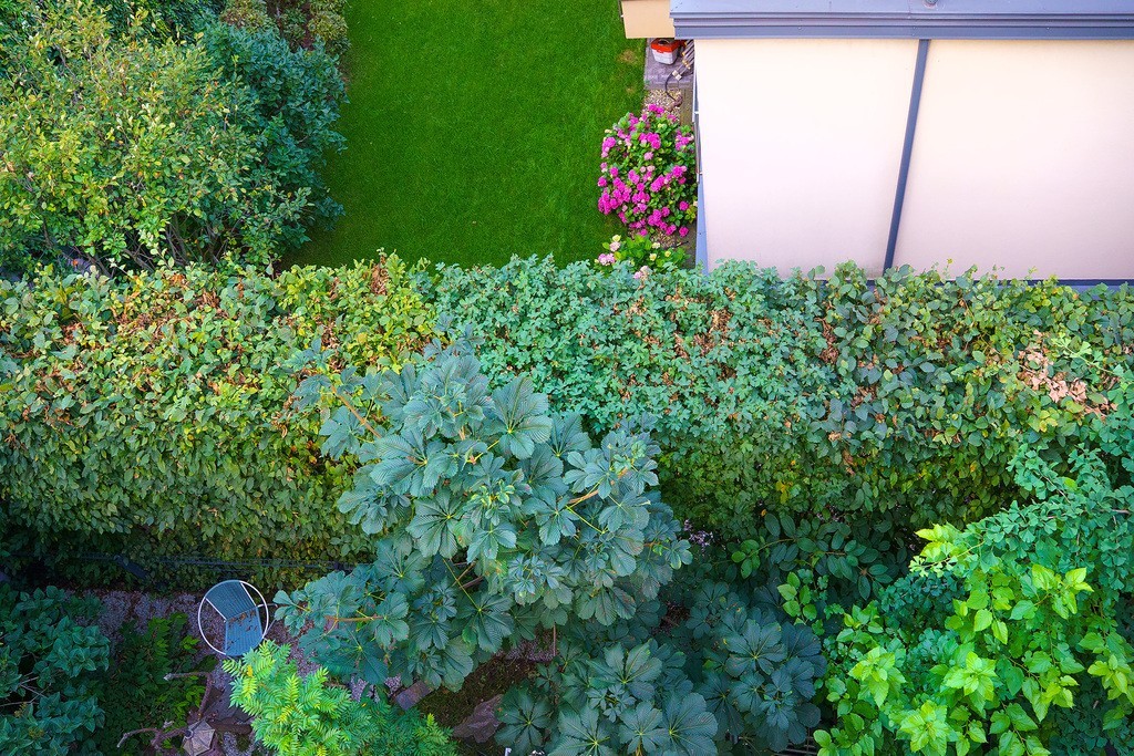 - Ogród z wyjściem z salonu, otoczony zielenią