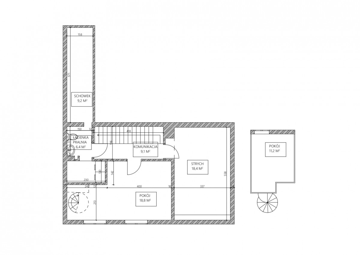 Dwa pokoje (18,8 m² i 11,2 m², połączone schodami) - idealne na gabinet lub pokój hobby.