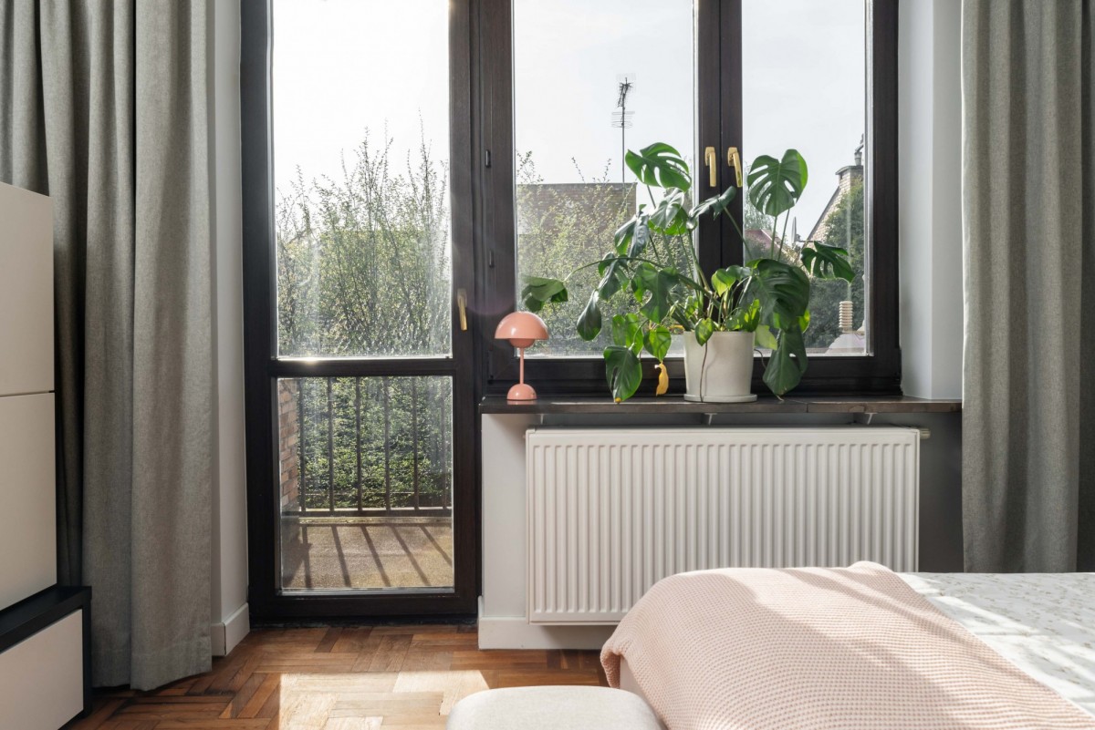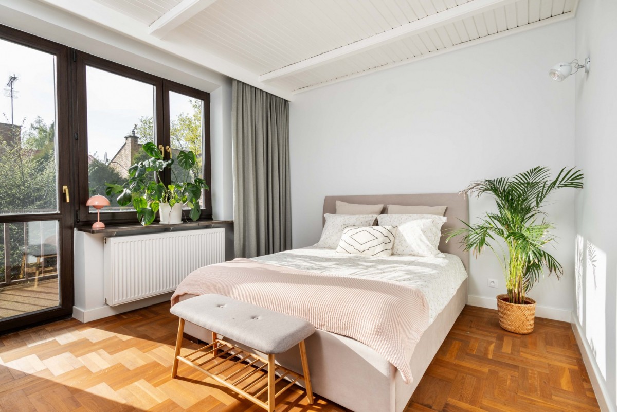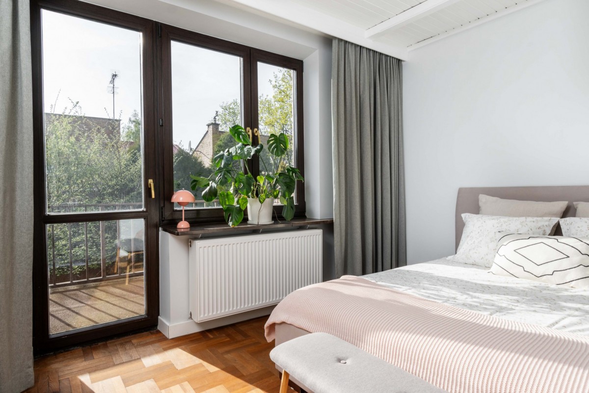 Sypialnia główna (14 m²) z balkonem i widokiem na ogród.