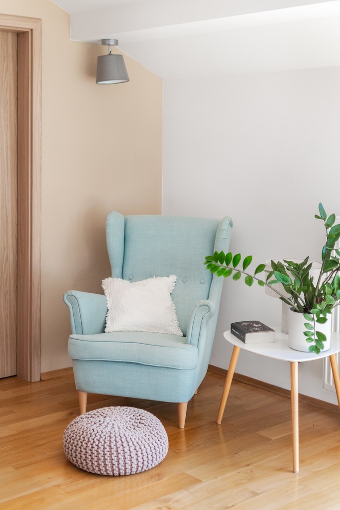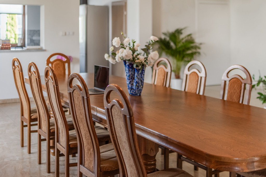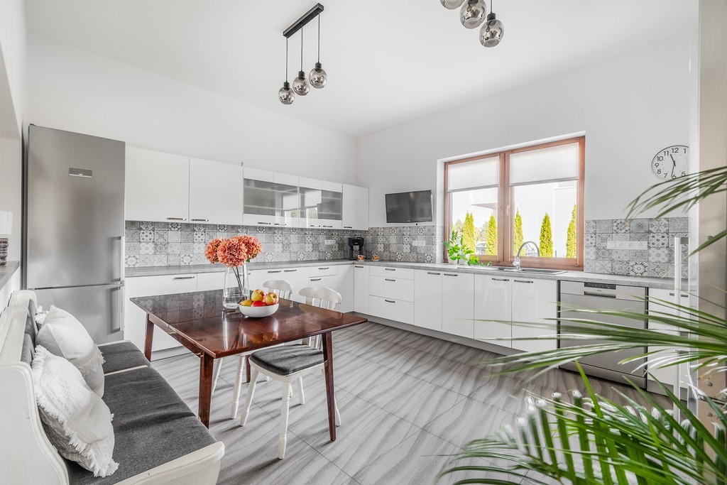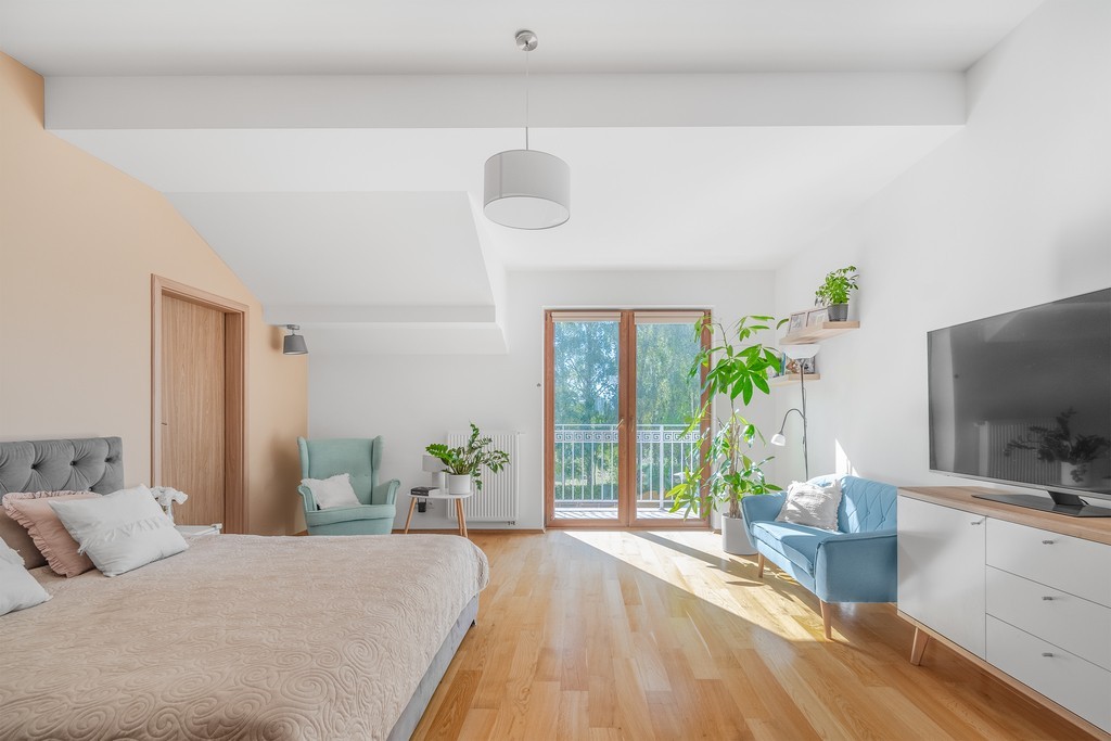 - Otwarta przestrzeń dzienna: salon z kuchnią i jadalnią;