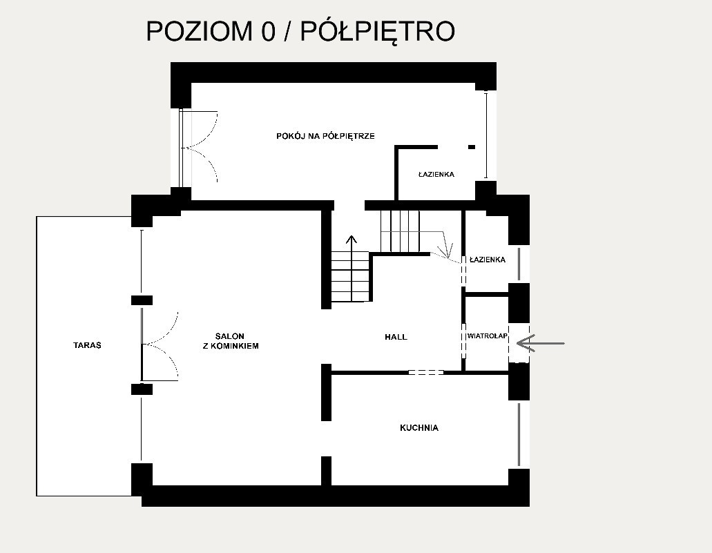 Na półpiętrze znajduje się dodatkowy duży pokój z łazienką i wyjściem na ogródek;