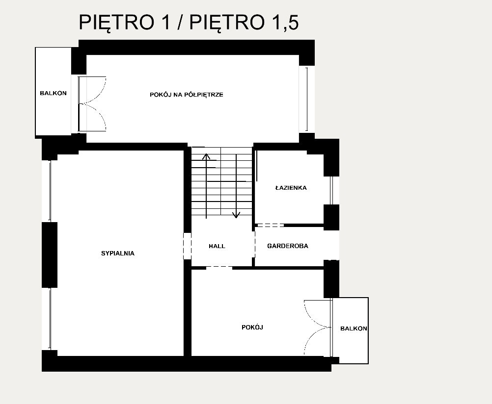 - pierwszego piętra gdzie znajdują się dwa pokoje (w tym jeden z balkonem), garderoba i łazienka. Warto powiedzieć, że pokoje mają po 30 m2 i dużo okien co powoduje możliwość wydzielenia większej ilości pomieszczeń.