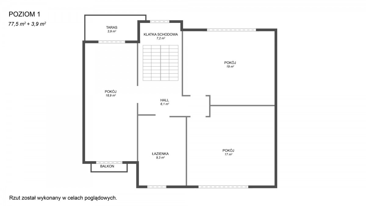 - Sypialnia główna (19 m²) - z wyjściem na taras o powierzchni 3 m² i balkon,