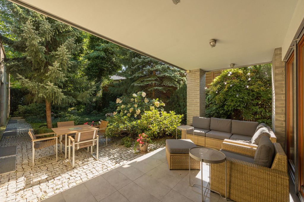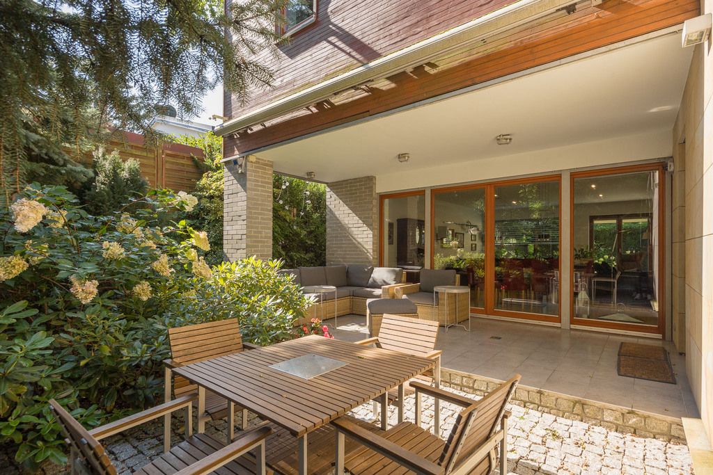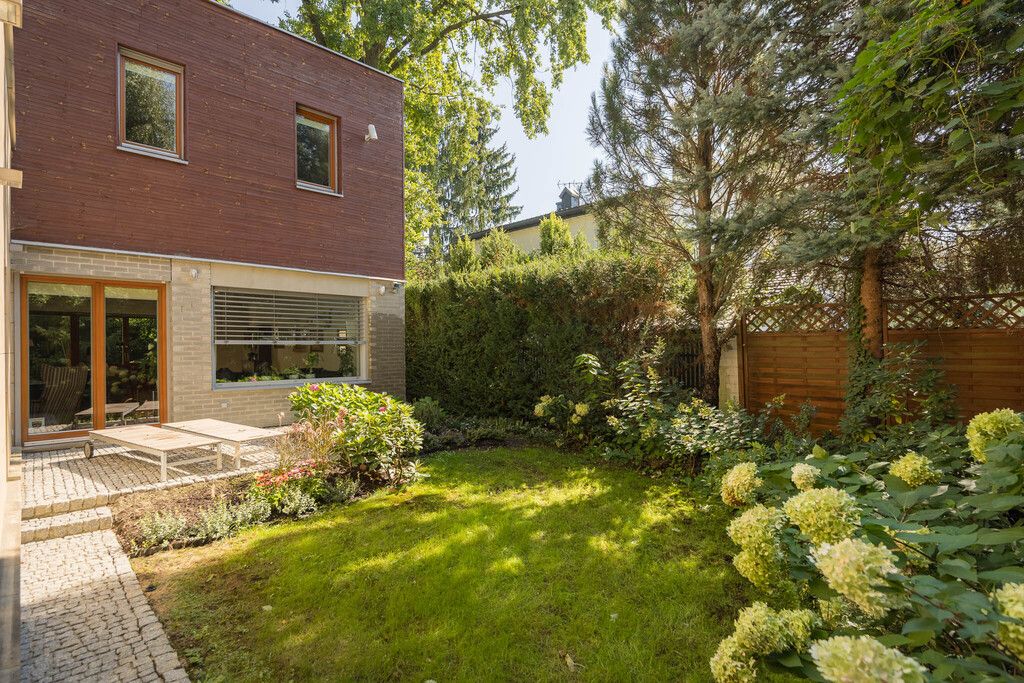 Dom jest osadzony na działce o powierzchni 840,3 m², przy czym dojazd do posesji stanowi dodatkowa działka o wielkości 460 m2 i jest rozwiązaniem sprzyjającym prywatności. Ogród, zaprojektowany z pietyzmem przez architekta krajobrazu, stanowi prawdziwą ozdobę i zachwyca bogactwem gatunkowym — rosną tu dorodne świerki, akacje i dęby. Gęste żywopłoty z cisów tworzą naturalną barierę dyskrecji oraz dają przyjemny, kojący cień w upalne dni.