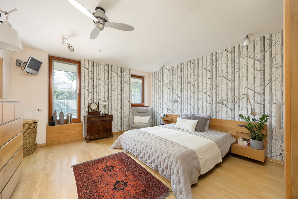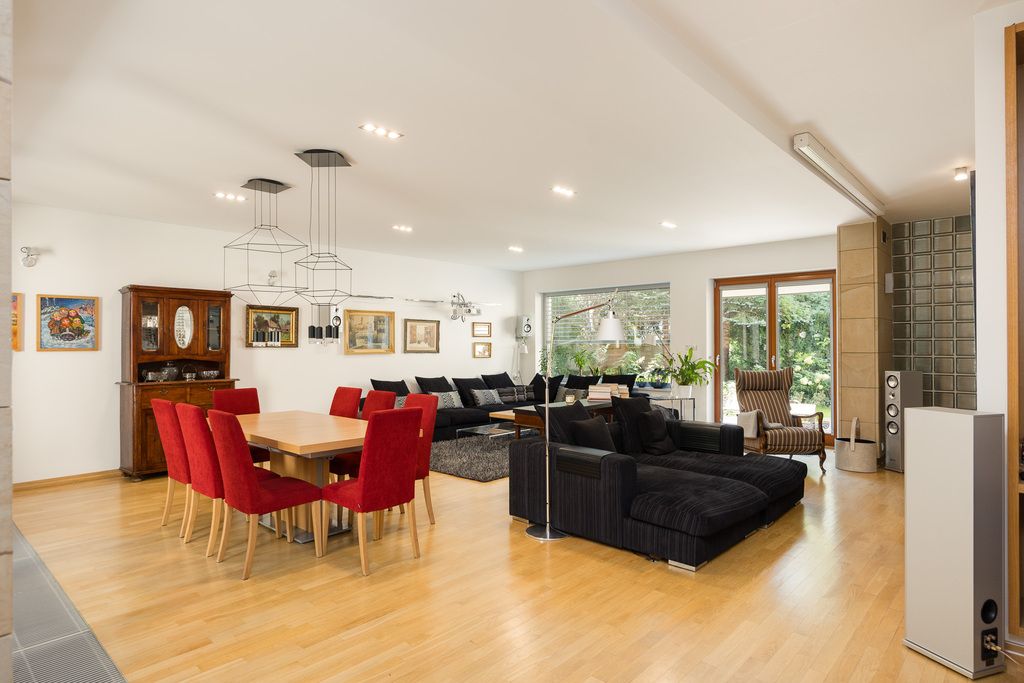Wnętrze projektowano z myślą o maksymalnej wygodzie i intuicyjnej funkcjonalności. Pomieszczenia zachwycają przestronnością i doskonałym doświetleniem, uzyskanym dzięki imponującym przeszkleniom, które płynnie łączą dom z otaczającym go ogrodem. Stan techniczny jest wzorowy — budynek był regularnie konserwowany i utrzymywany z pedantyczną dbałością o każdy detal. Wysokość pomieszczeń, oscylująca między 270 a 280 cm, potęguje wrażenie swobody.