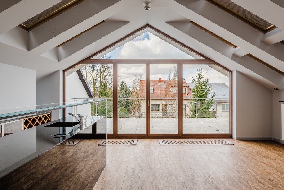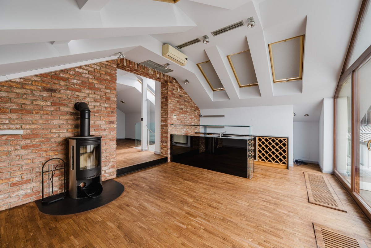 Poddasze to część rekreacyjna - open space z kominkiem, barem, tarasem oraz łazienką.
