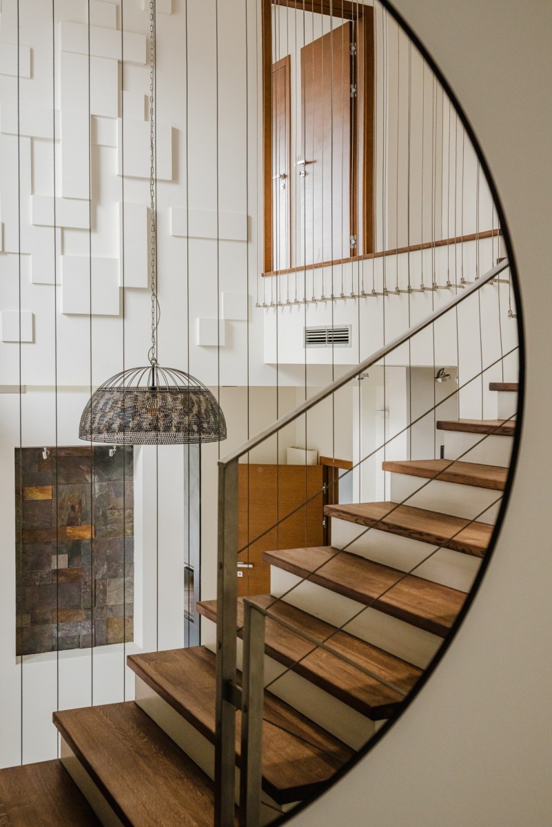 Na piętrze znajduje się sypialnia główna z łazienką, garderobą, gabinetem i tarasem, a także 3 dodatkowe sypialnie i łazienka.