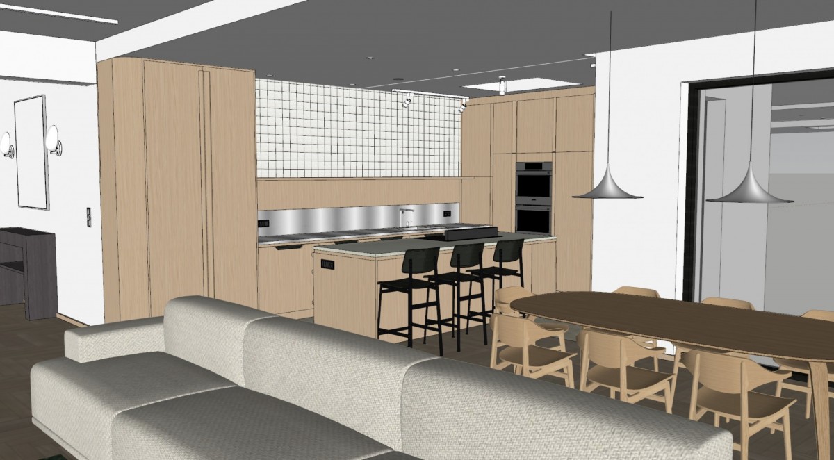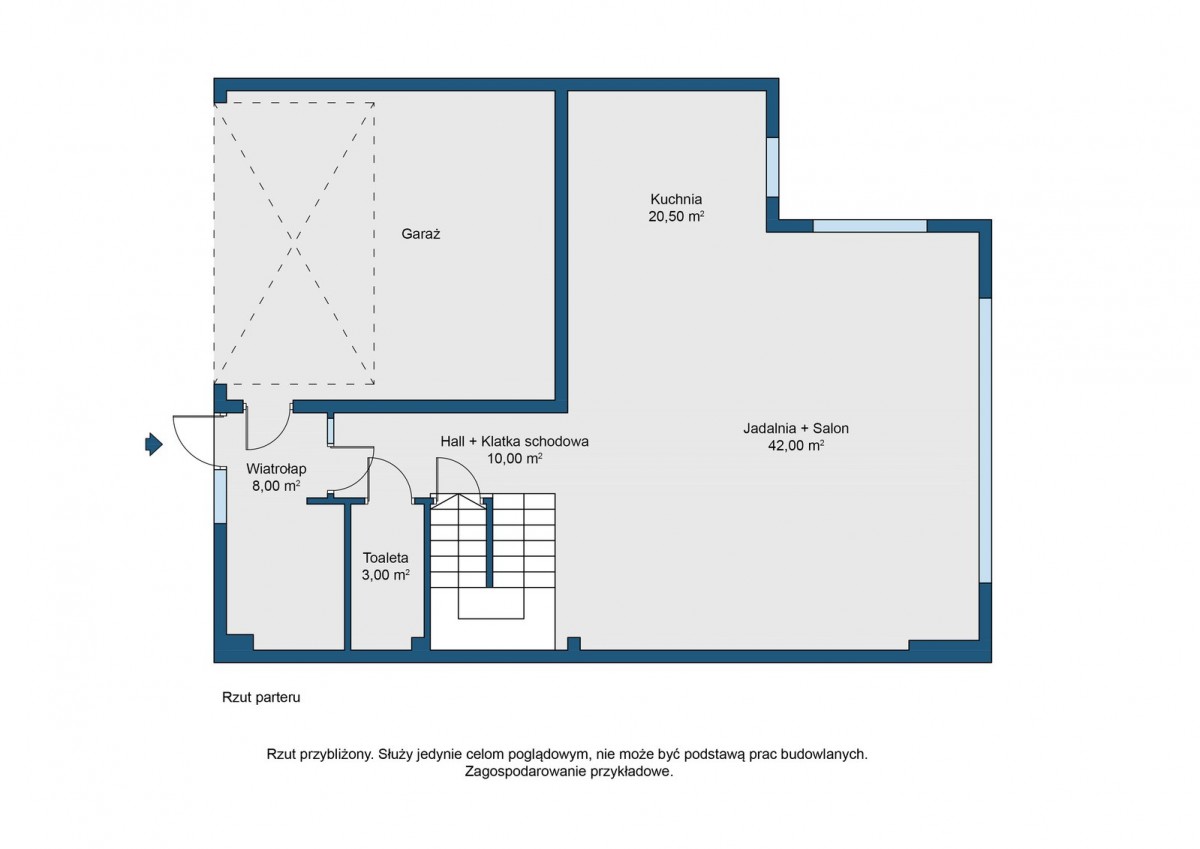 Reprezentacyjna strefa dzienna (salon z jadalnią i kuchnią - 62 m²), kuchnia z wyjściem na taras, garaż na dwa auta, pomieszczenie gospodarcze.