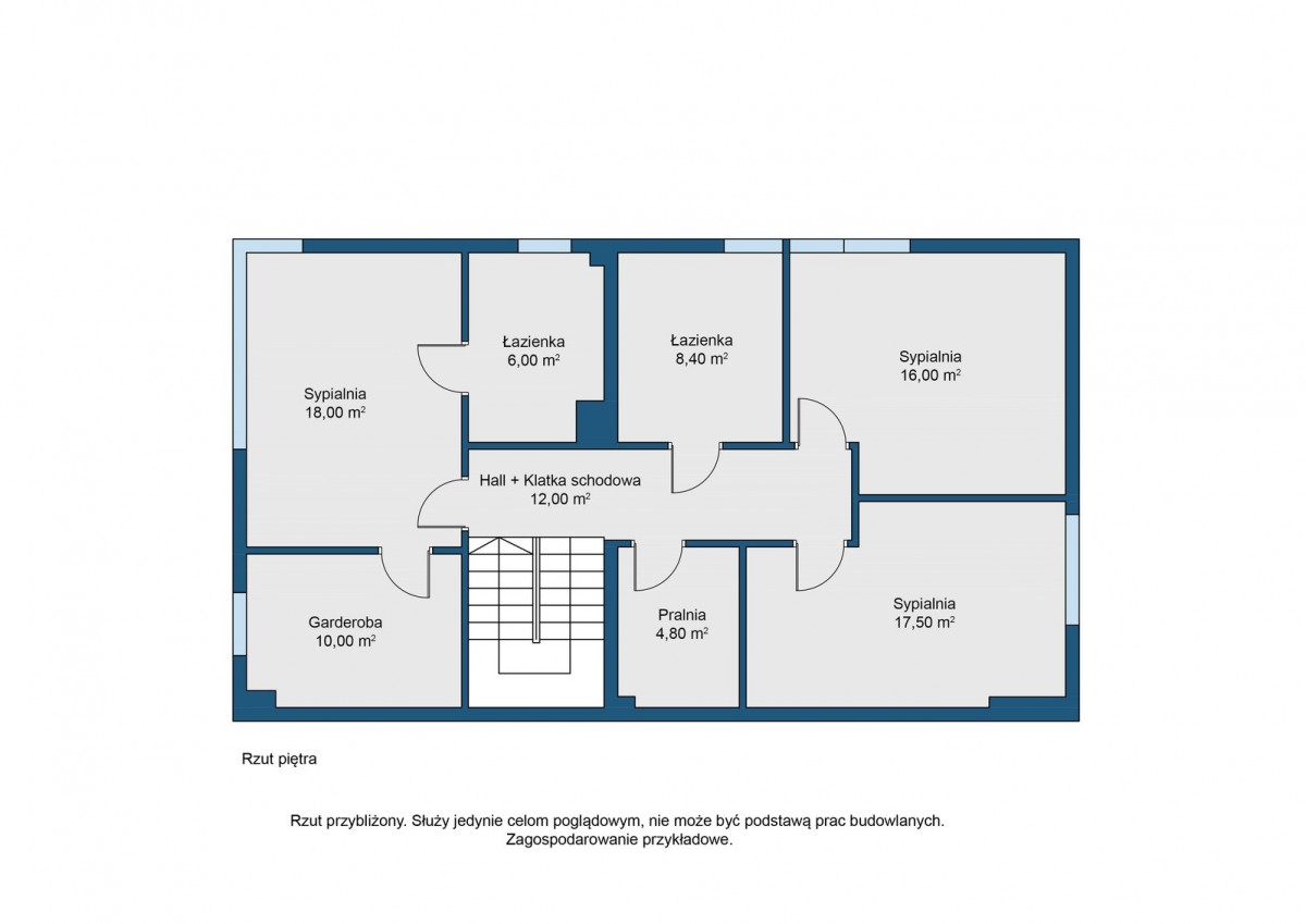 Master bedroom z prywatną łazienką i garderobą oraz wyjściem na taras rekreacyjny (ok. 30 m²), dwie sypialnie, łazienka główna, pralnia.