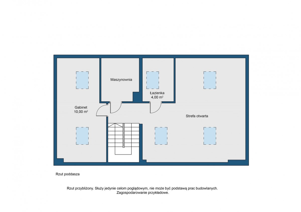 Gabinet, łazienka oraz otwarta, wielofunkcyjna przestrzeń - idealna jako pokój rekreacyjny, studio lub dodatkowa sypialnia.