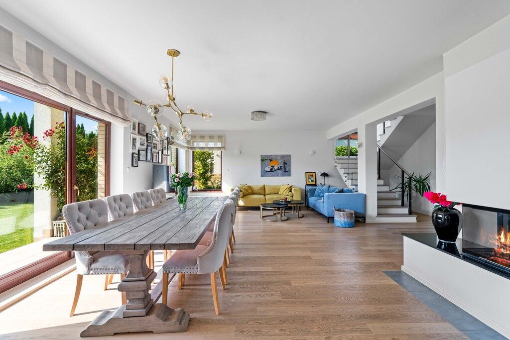 - przestronny salon z kominkiem połączony z jadalnią i kuchnią