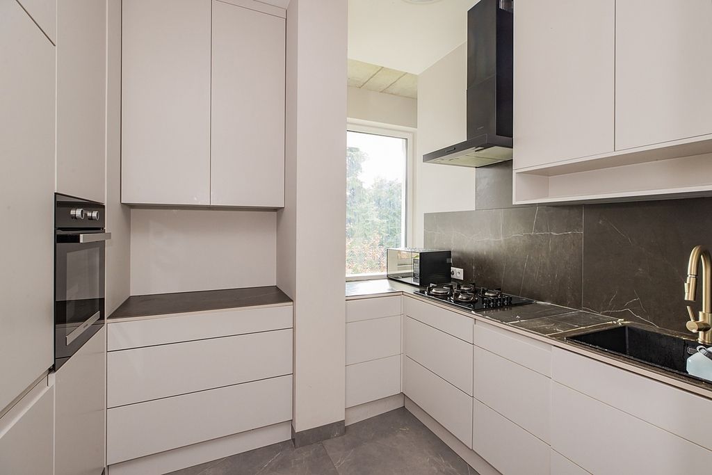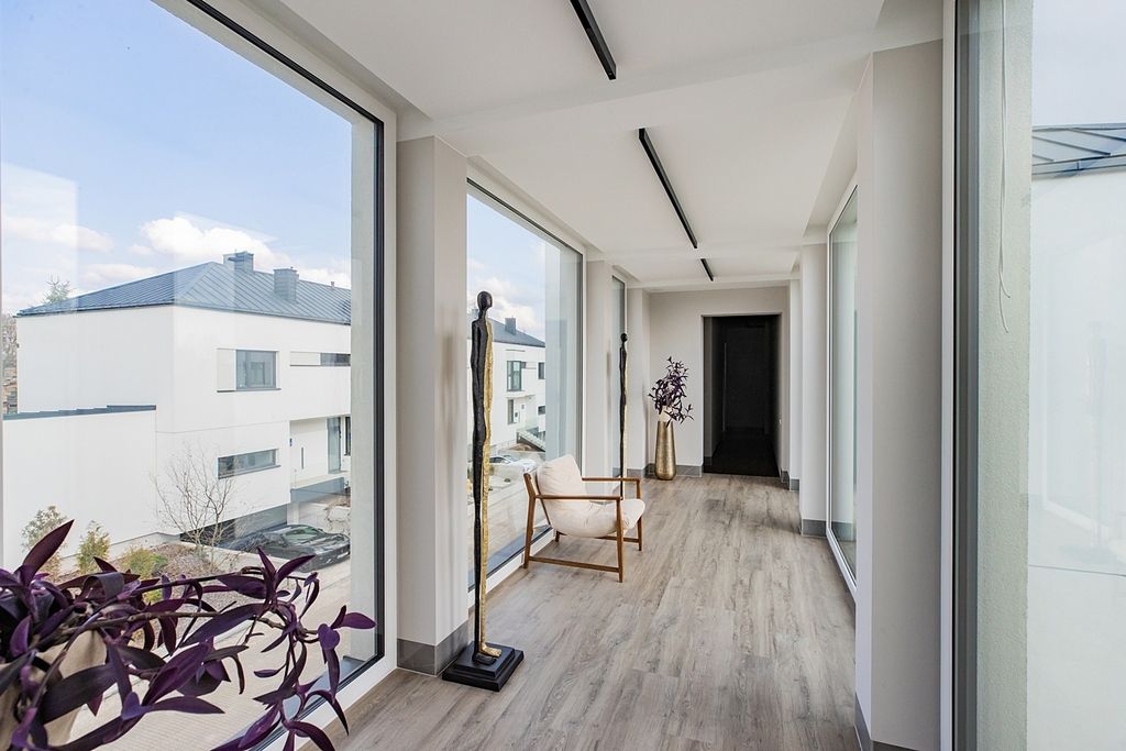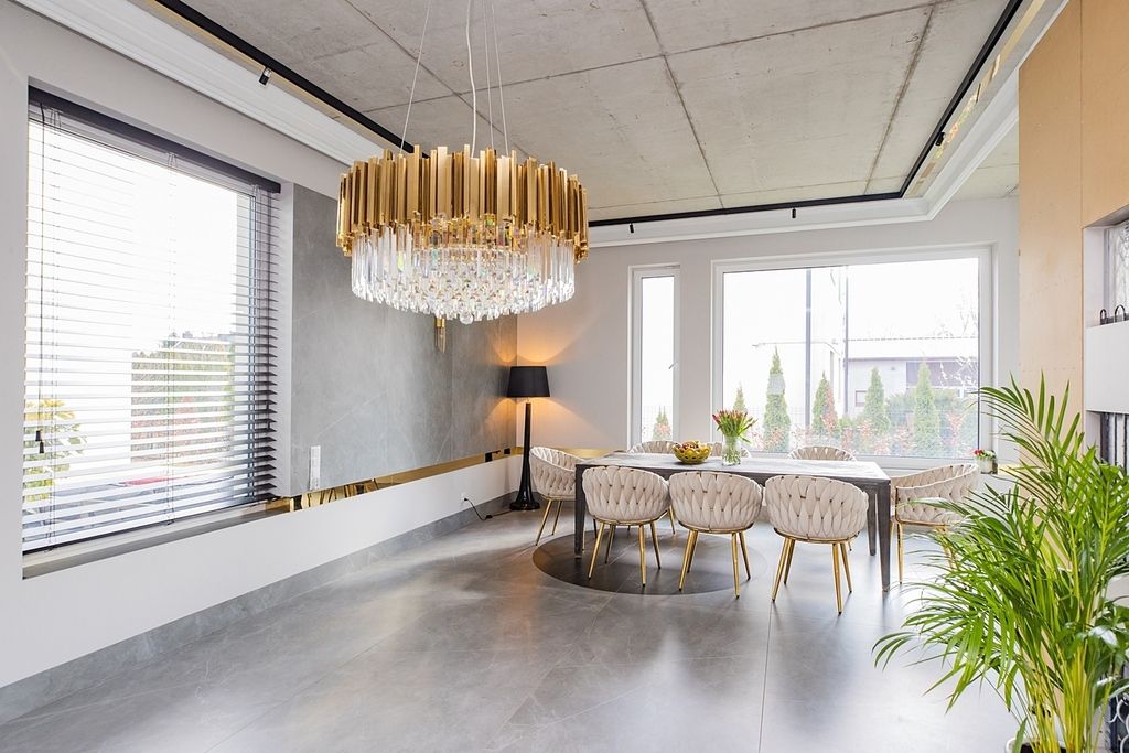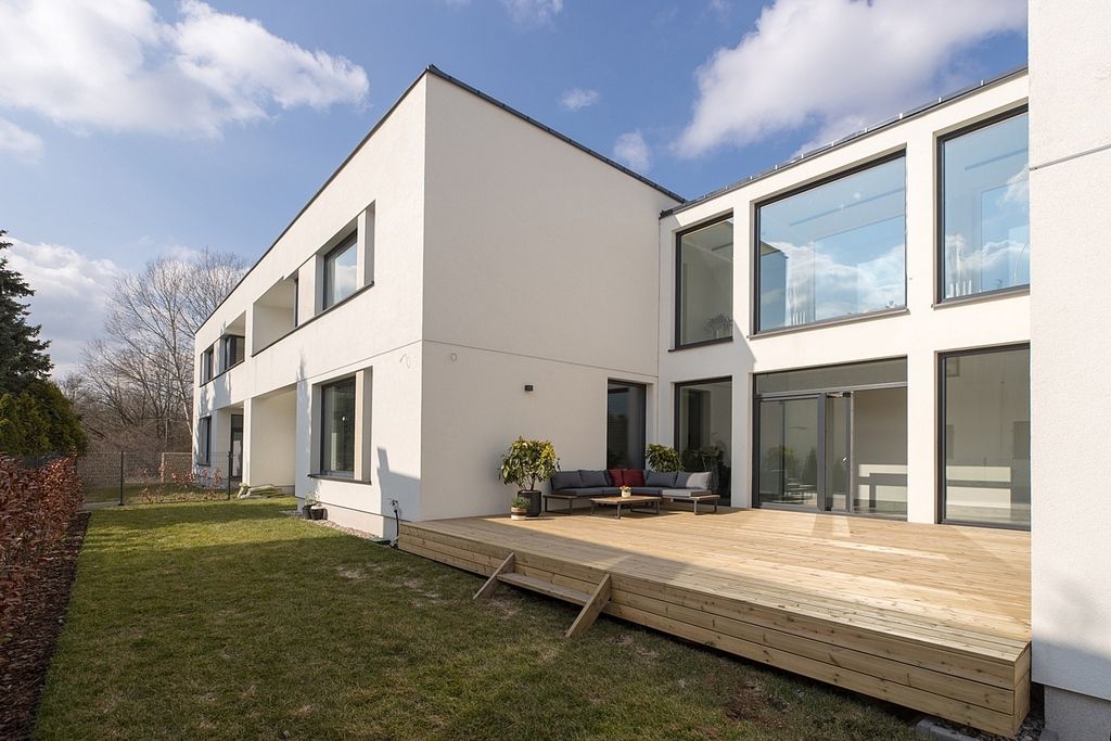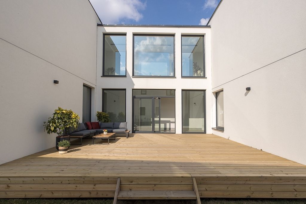 Wysokie sufity w połączeniu z panoramicznymi przeszkleniami sprawiają, że wnętrza są skąpane w naturalnym świetle, co potęguje poczucie przestronności. Unikatowym elementem domu jest szklany, słoneczny łącznik - prestiżowa strefa idealna na prywatną galerię sztuki lub zimowy ogród. Dopełnieniem całości jest drewniany taras, który pełni rolę stylowego patio.