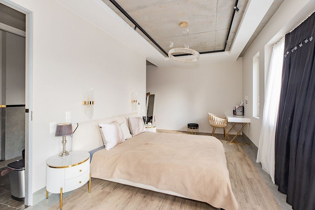 - Piętro (strefa nocna): prywatny azyl oddzielony od reszty domu stylowymi schodami, zapewniający spokój i intymność