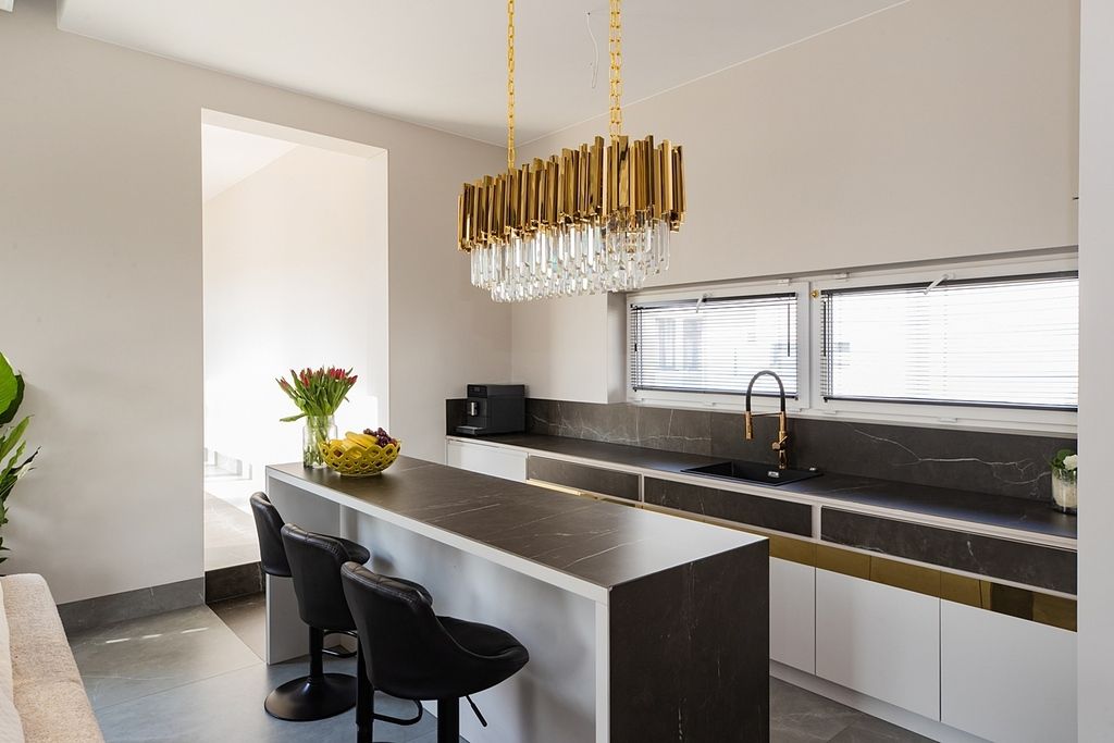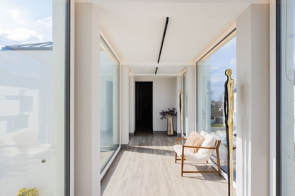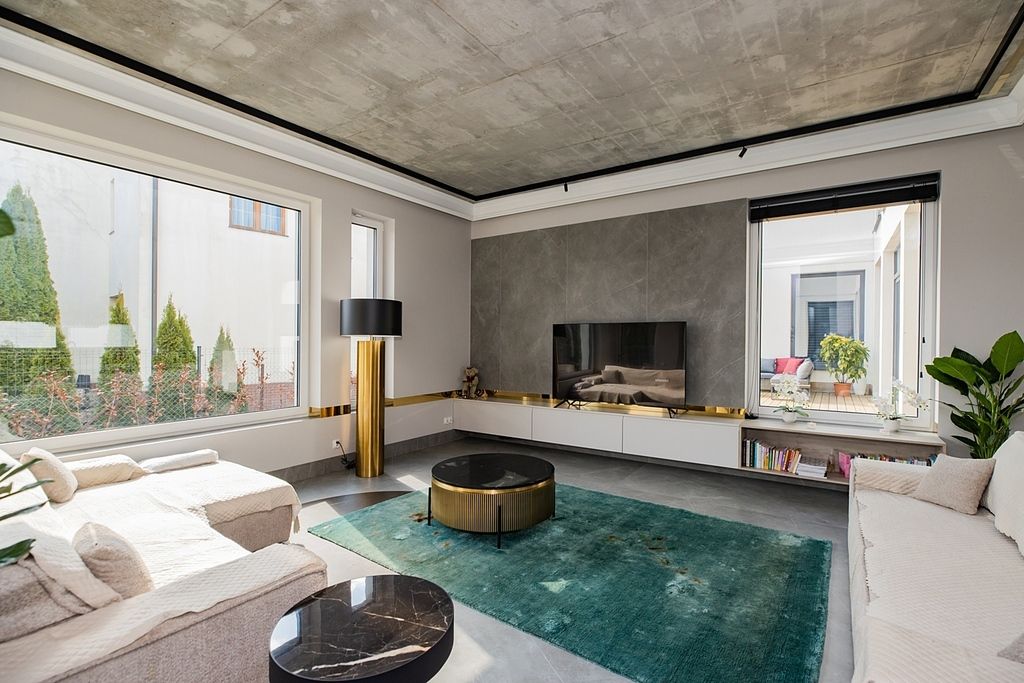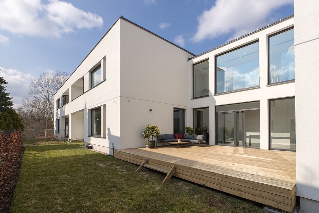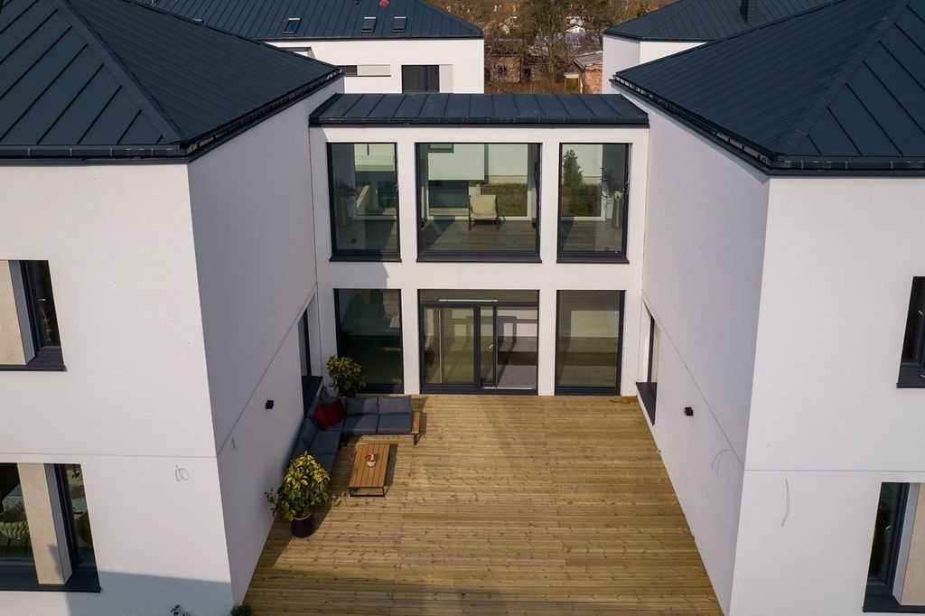Wysokie sufity w połączeniu z panoramicznymi przeszkleniami sprawiają, że wnętrza są skąpane w naturalnym świetle, co potęguje poczucie przestronności. Unikatowym elementem domu jest szklany, słoneczny łącznik - prestiżowa strefa idealna na prywatną galerię sztuki lub zimowy ogród. Dopełnieniem całości jest drewniany taras, który pełni rolę stylowego patio.