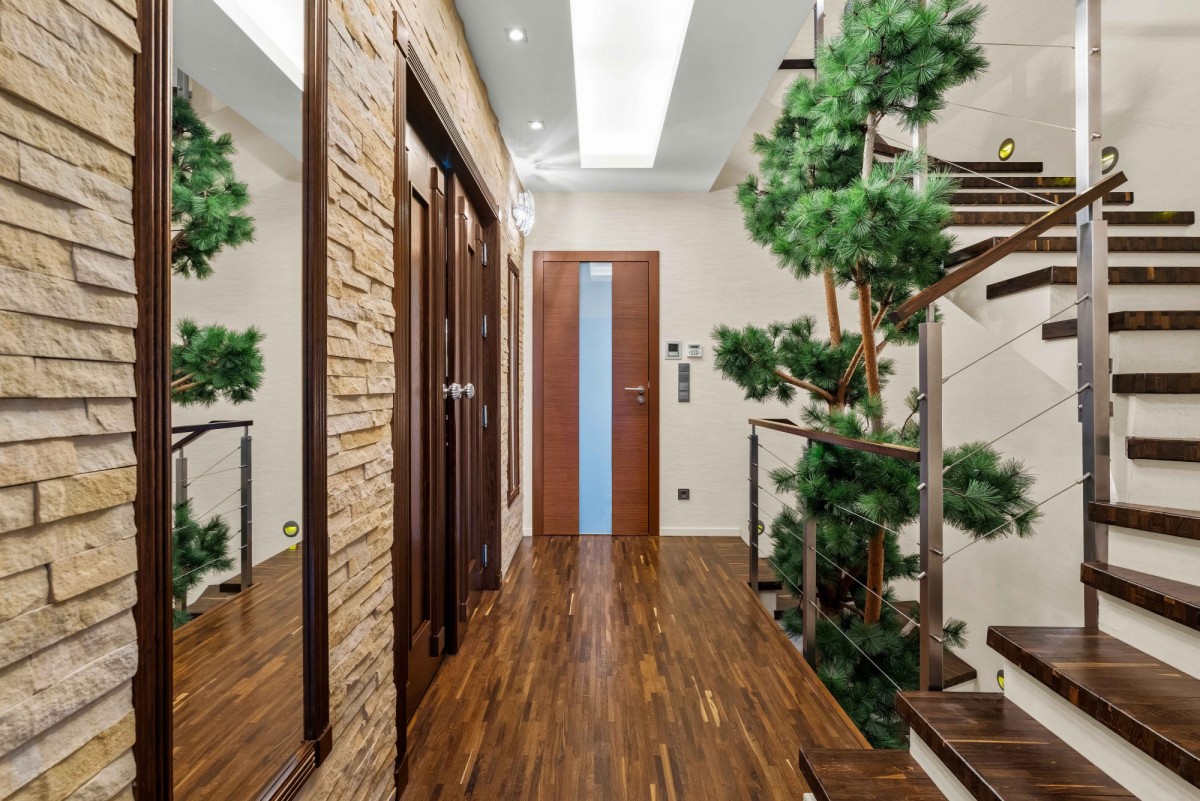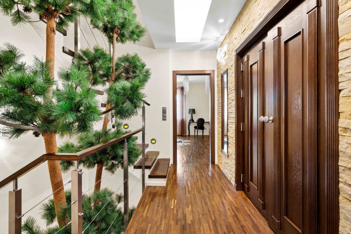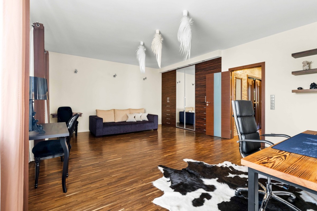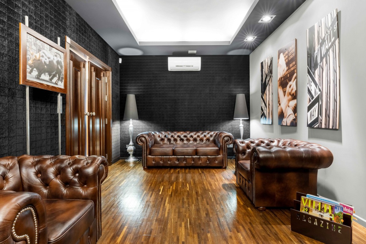 Wnętrze wykończone z wykorzystaniem wysokiej jakości naturalnych materiałów, takich jak drewno i kamień. Charakter wnętrz podkreślają elementy ścian wykończone naturalnym piaskowcem oraz podłoga wykonana z wysokiej klasy dębu przemysłowego. Większość zabudowy powstała na indywidualne zamówienie.