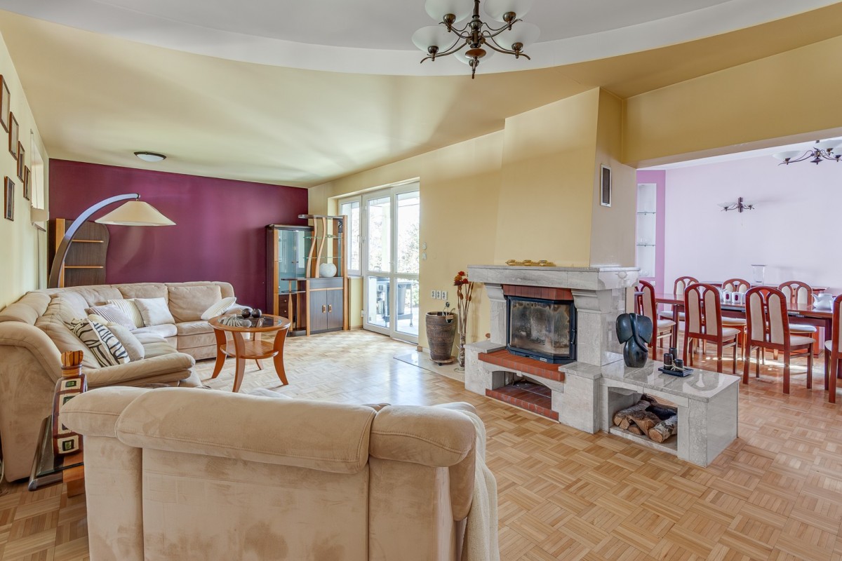 Przestronny salon z kominkiem i wyjściem na duży taras (33 m2) oraz ogród (140 m2)