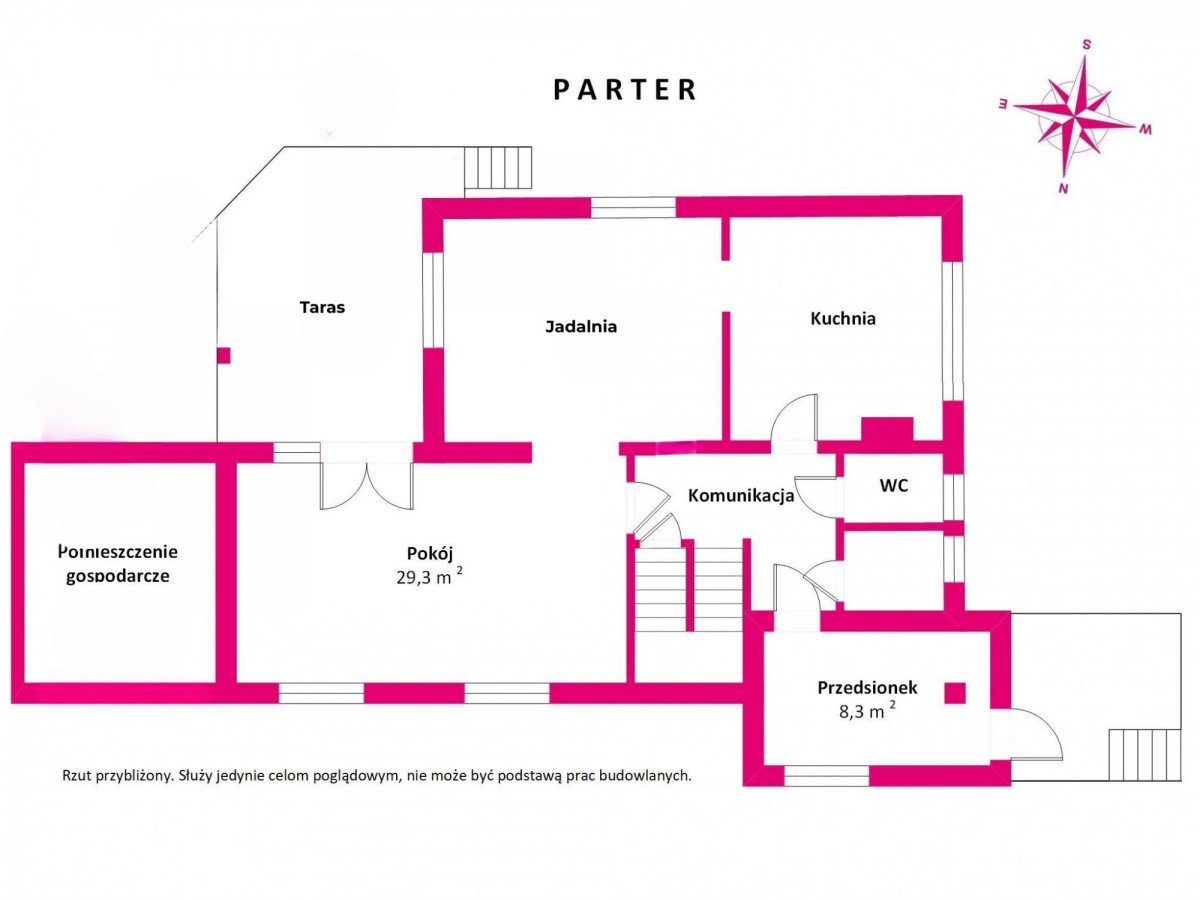 Schody: zabiegowe betonowe prowadzące od piwnicy na pierwsze piętro, na poddasze schody drewniane na konstrukcji słupowej (rura stalowa).
