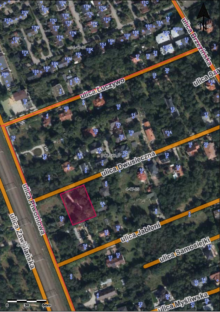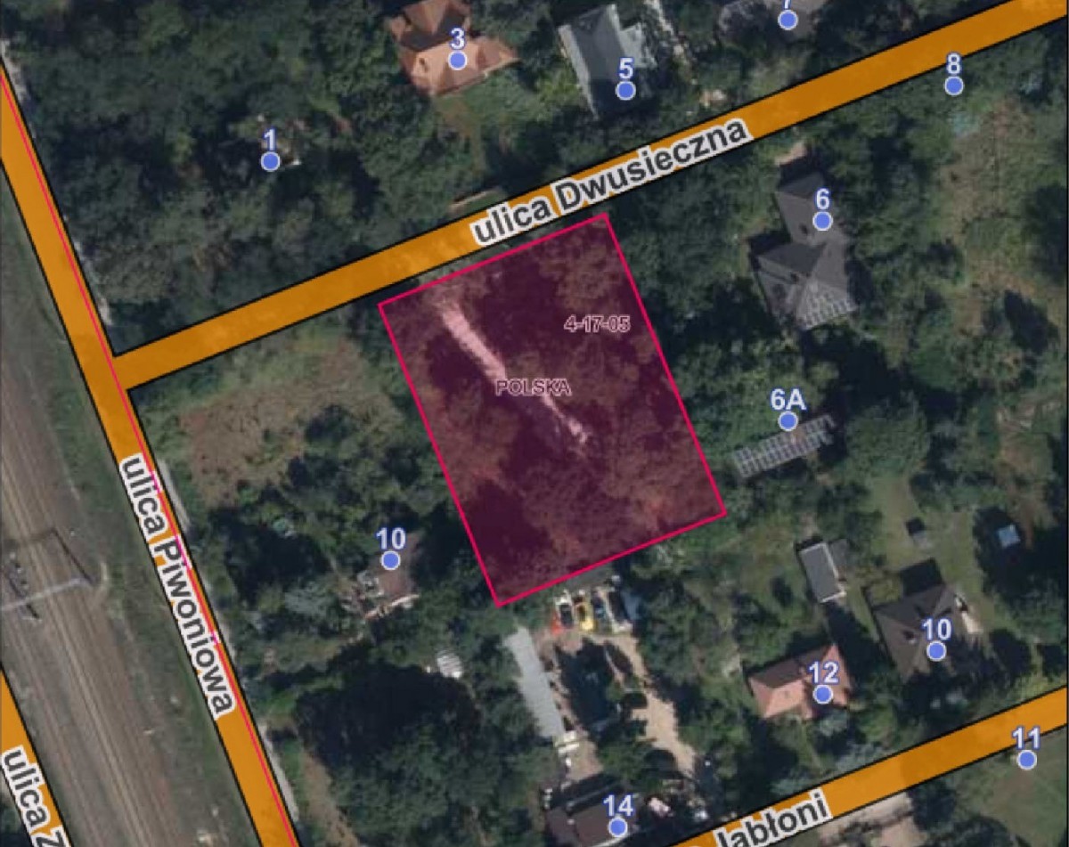 Do sprzedaży działka o powierzchni 2173m2 przy ul. Dwusiecznej, na warszawskiej Choszczówce. Szerokość działki 40m od ulicy, głębokość 51,5m.