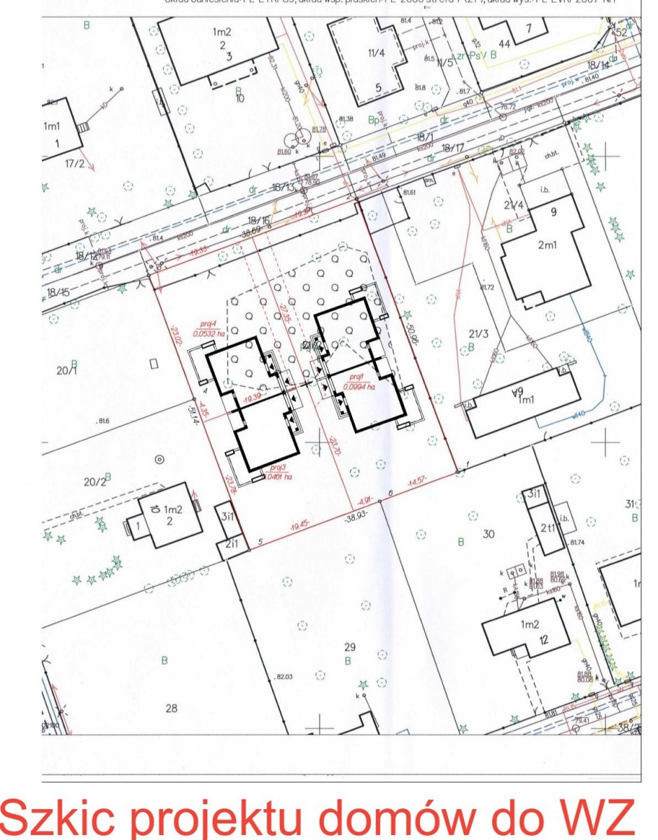 Na inwestycje, pod budowę dwóch budynków jednorodzinnych w zabudowie bliźniaczej i jednego budynku jednorodzinnego wolnostojącego dwulokalowego.