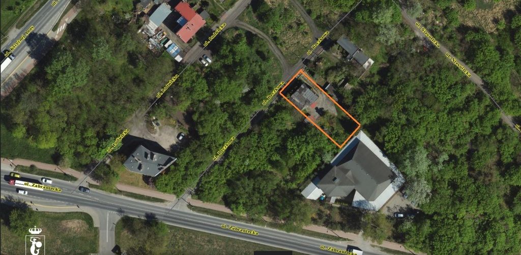 Działka aktualnie zabudowana domem z wiatą i pomieszczeniem gospodarczym - w odległości 85 m od ul. Zabranieckiej.
