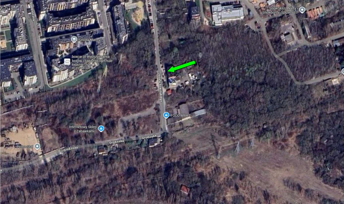 Teren: płaski, nieogrodzony, niezagospodarowany, porośnięty drzewami i niską roślinnością
