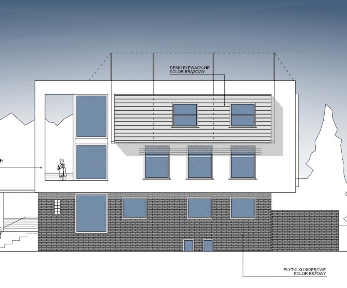 Na piętrze obecnie znajduje się duży pokój z wyjściem na obszerny taras oraz toaleta.