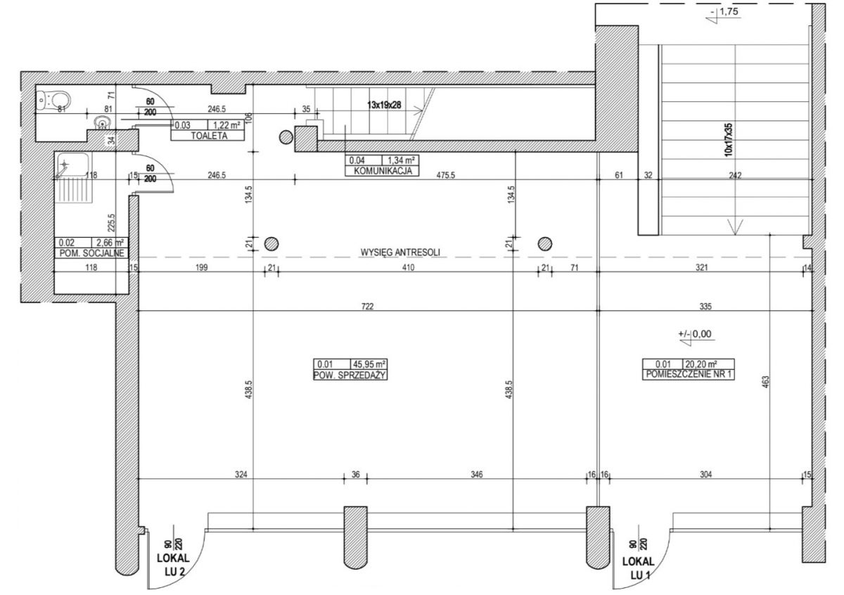 - Przestronna sala sprzedaży 45,95 m² + zaplecze socjalne, toaleta, schowek oraz komunikacja.