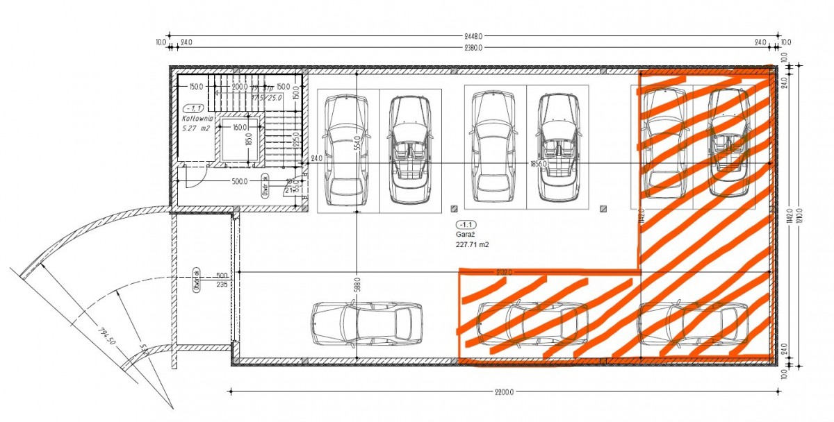 Powierzchnia na kondygnacji podziemnej zaznaczona na pomarańczowo.