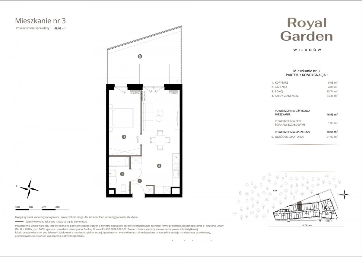 Oferowany apartament o powierzchni 48,08 m² obejmuje: