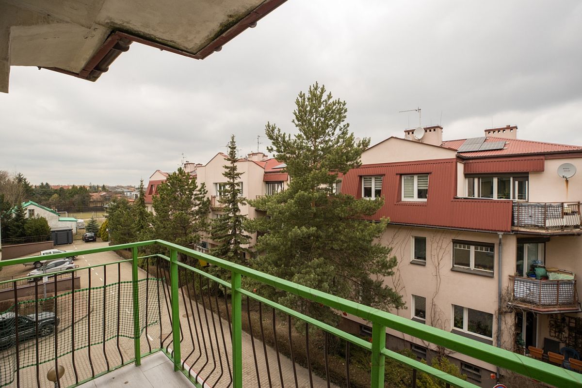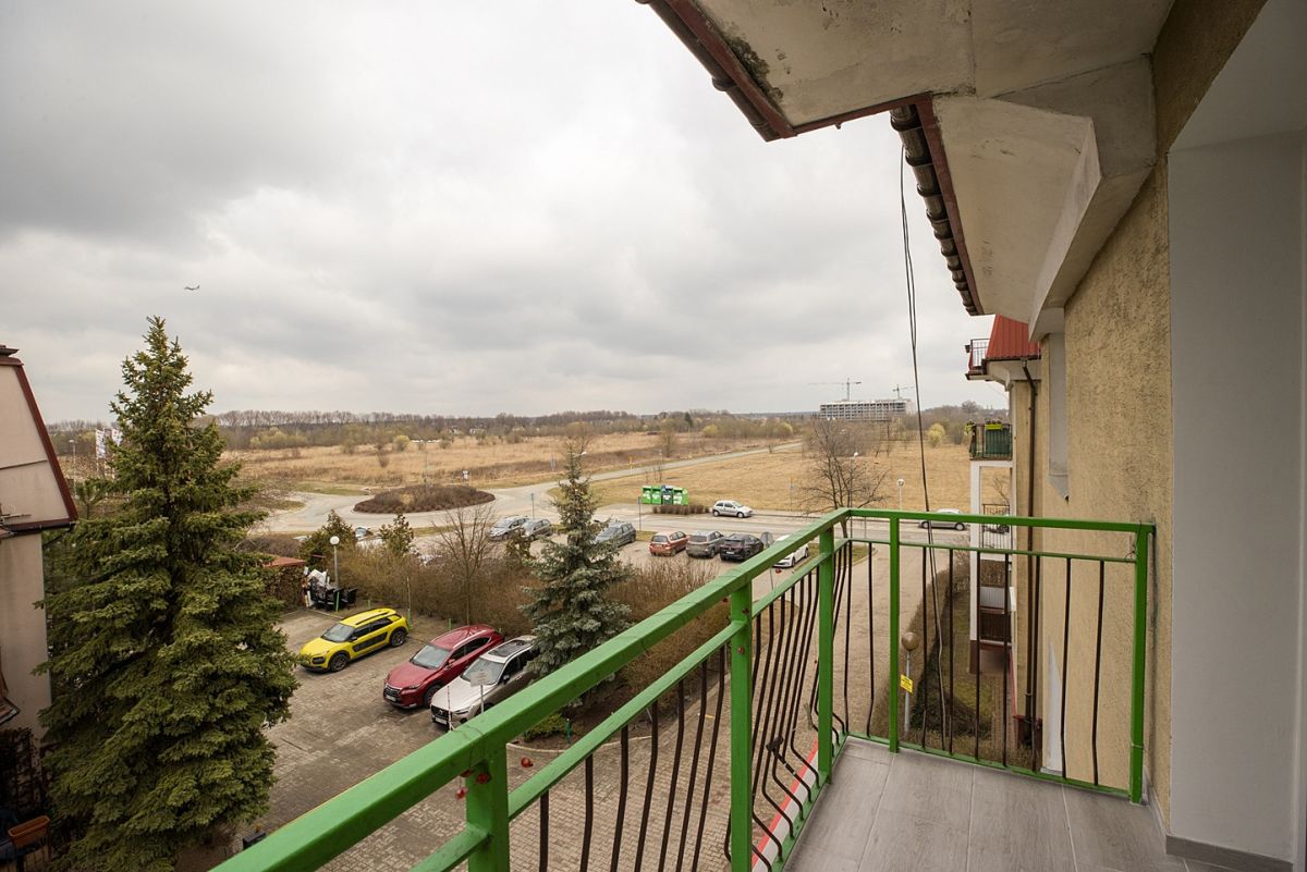 Przestrzeń i widok: Do mieszkania przynależy duży balkon z kojącym, ładnym widokiem - idealne miejsce na poranną kawę.
