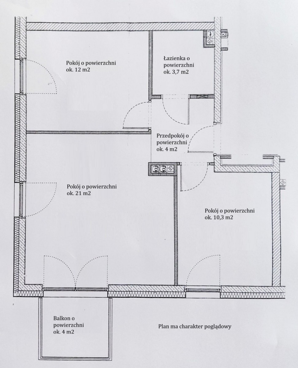 Z dużego pokoju można wyjść na balkon o pow. ok. 4 m2 (ekspozycja południowa). Mieszkanie jest słoneczne. Okna dużego pokoju wychodzą na zachód i południe. Jedna z sypialni ma ekspozycję południową a druga zachodnią.