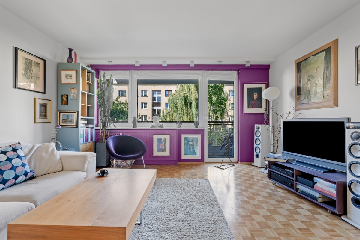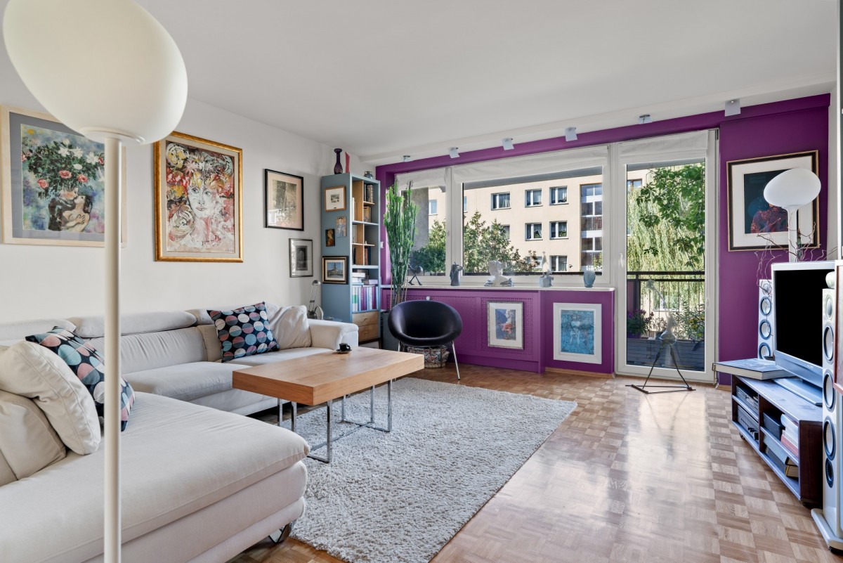 ustawnego, jasnego salonu z wyjściem na przestronny balkon