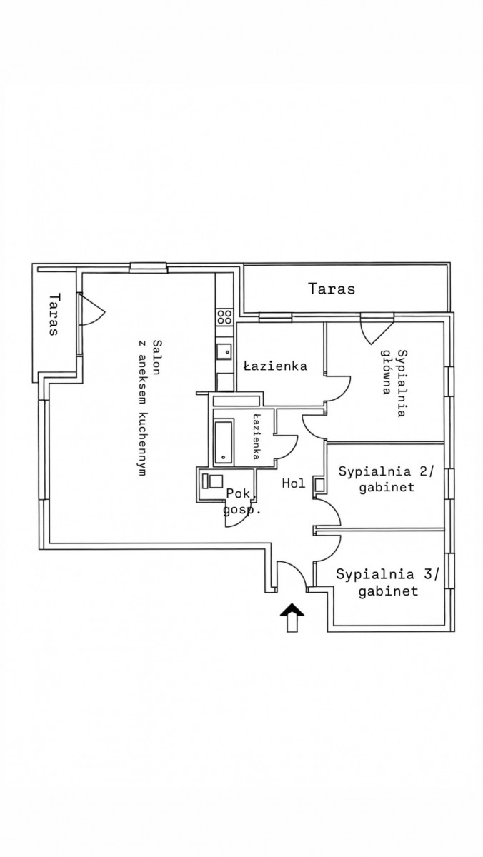 - salon z aneksem kuchennym (41,19 m²) z wyjściem na taras (9,80 m²), ekspozycja południowo-wschodnia,