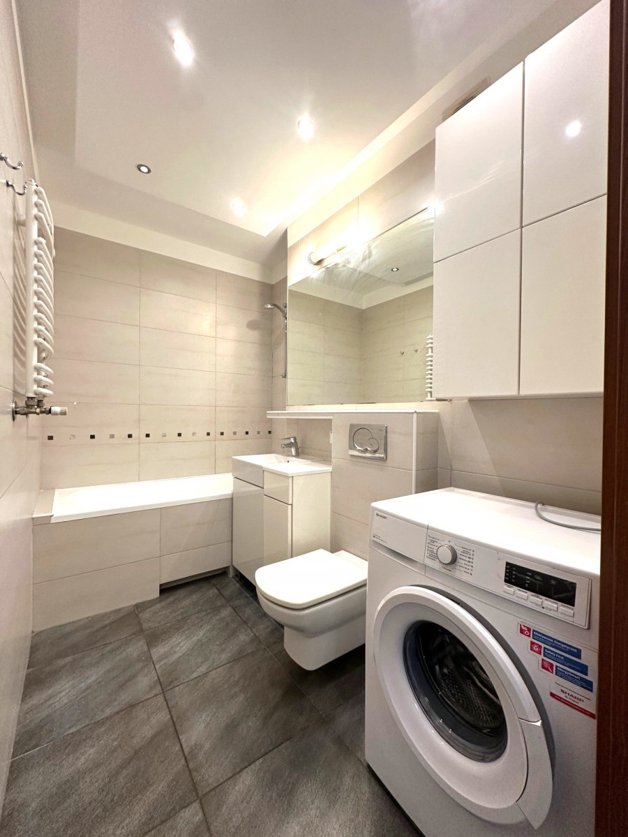 - łazienka z wanną, pralką oraz szafką na chemię,