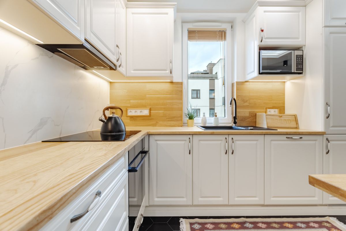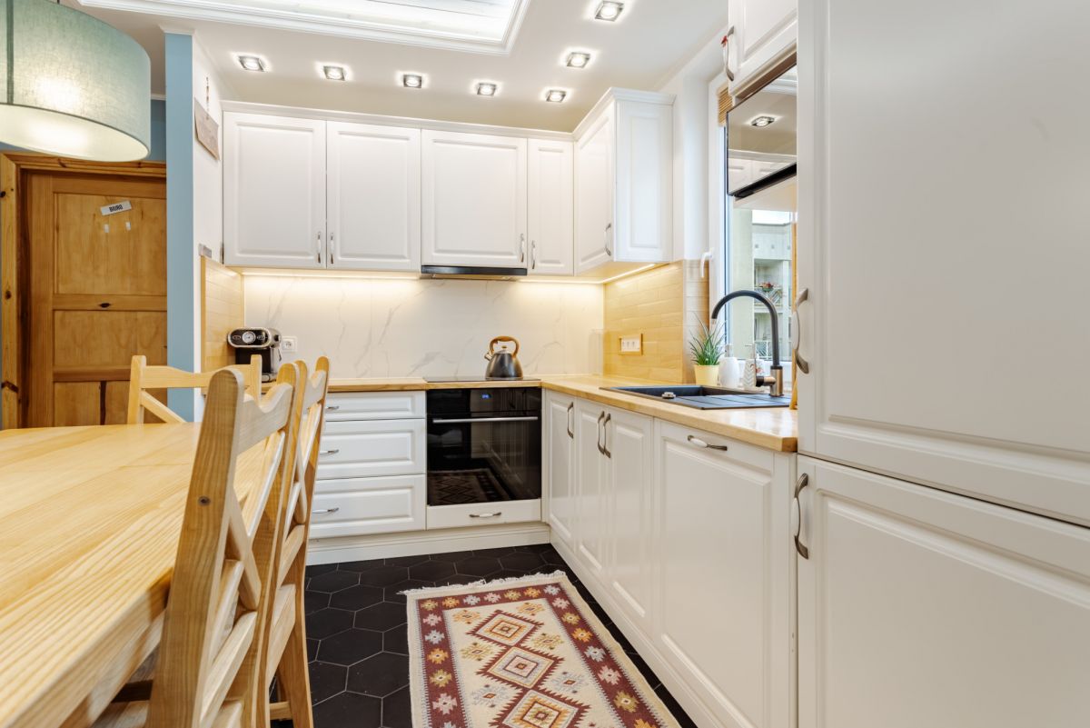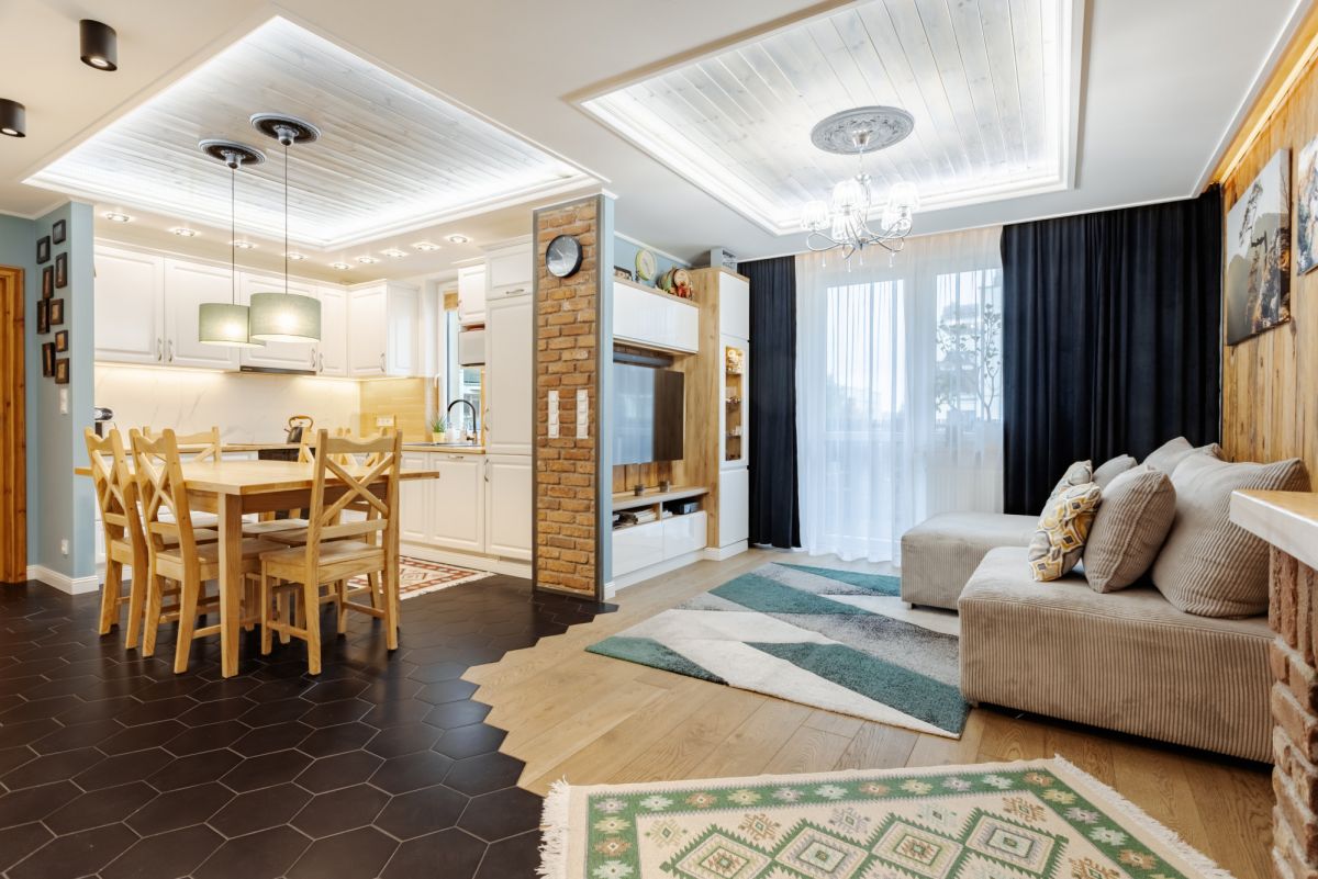 Salon z aneksem kuchennym - przestronny i jasny, z wygodną przestrzenią do wypoczynku i wyjściem na balkon. Aneks wyposażony w nowoczesne sprzęty AGD: piekarnik, płytę indukcyjną, lodówko-zamrażarkę, zmywarkę oraz praktyczną przesuwną wyspę, która świetnie sprawdza się zarówno jako dodatkowy blat, jak i miejsce do wspólnych posiłków.