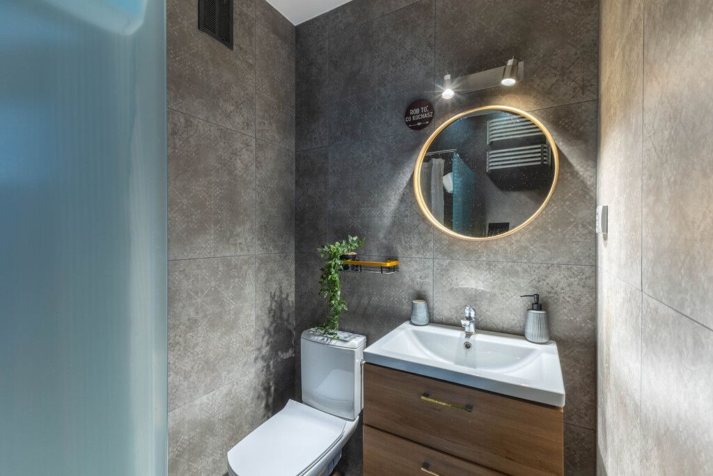 - 1 pomieszczenie, które obecnie służy za schowek ale ma przyłącza wodno-kanalizacyjne. W projekcie stanowiło pomieszczenie łazienkowe