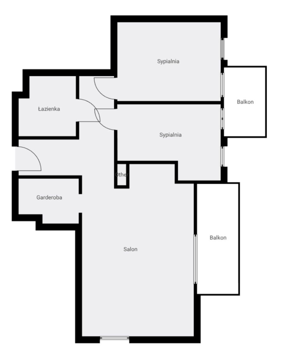 Mieszkanie położone jest na piątym piętrze budynku z dwiema windami. Po przekroczeniu progu mieszkania znajdujemy się w przedpokoju, skąd mamy wejścia do pozostałych pomieszczeń - dużego pokoju z balkonem, dwóch sypialni (w tym jednej z dodatkowym balkonem), łazienki , garderoby oraz kuchni w formie aneksu.