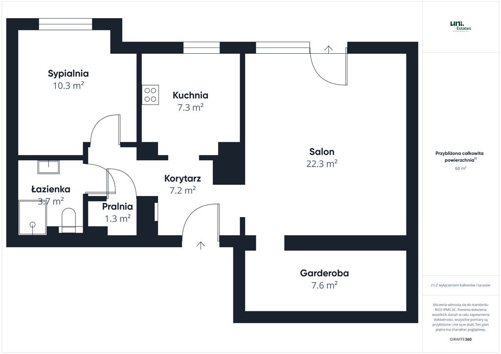 - Salon: 22,30 m² – parkiet dębowy, klimatyzacja,