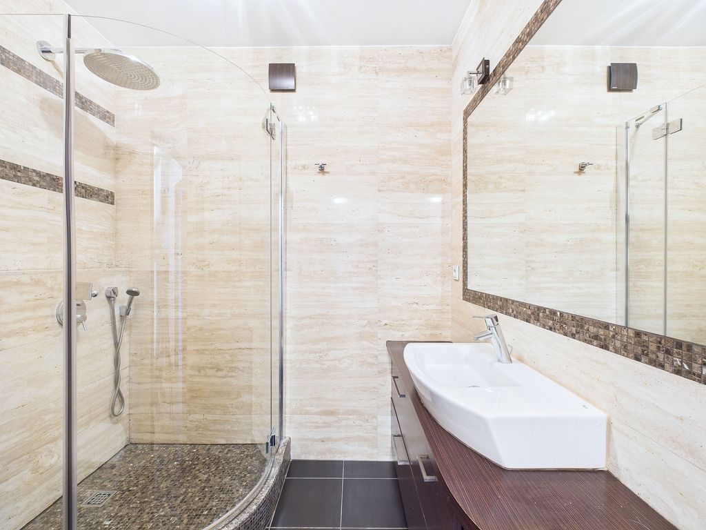 - Łazienka: 3,78 m² – z ogrzewaniem podłogowym, włoski trawertyn, gres, armatura Grohe i Roca,
